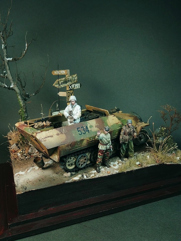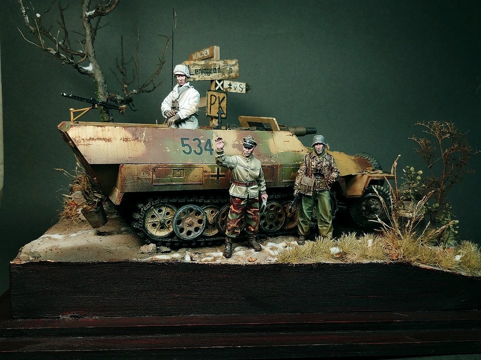 아무래도 단품은 휑하니 심심해서 인형 몇마리랑 타미야제 이정표세트 사용해서 간단한 비네트로 작업하였습니다..