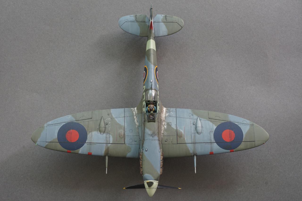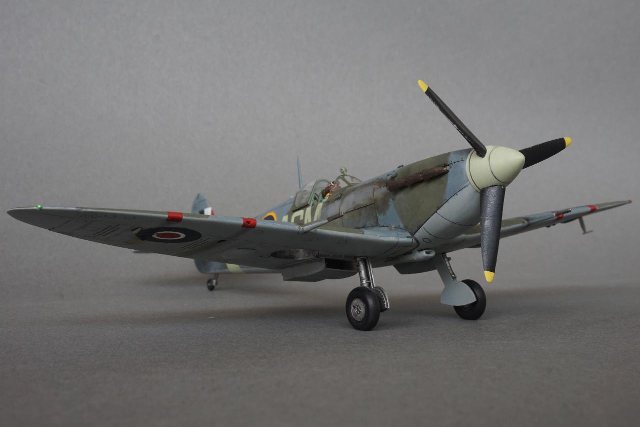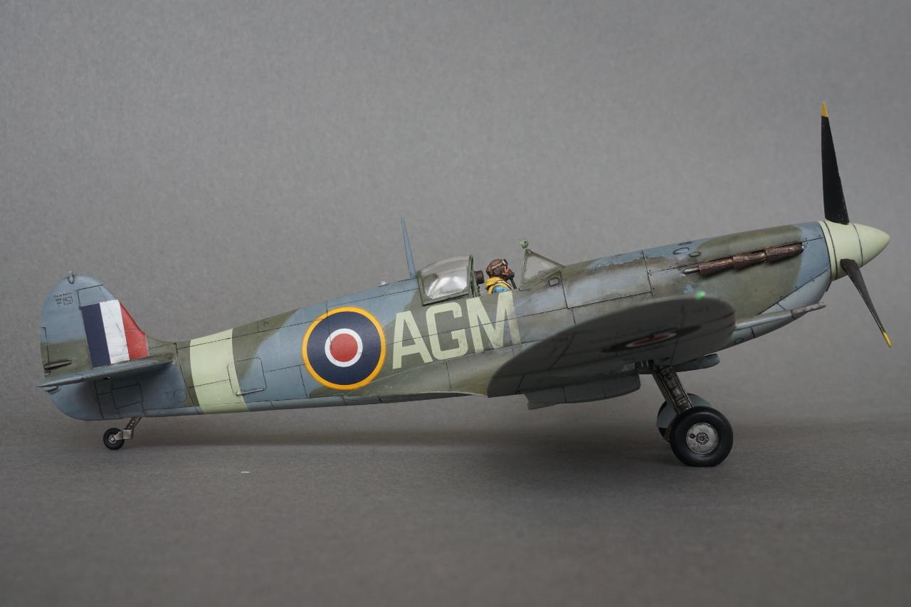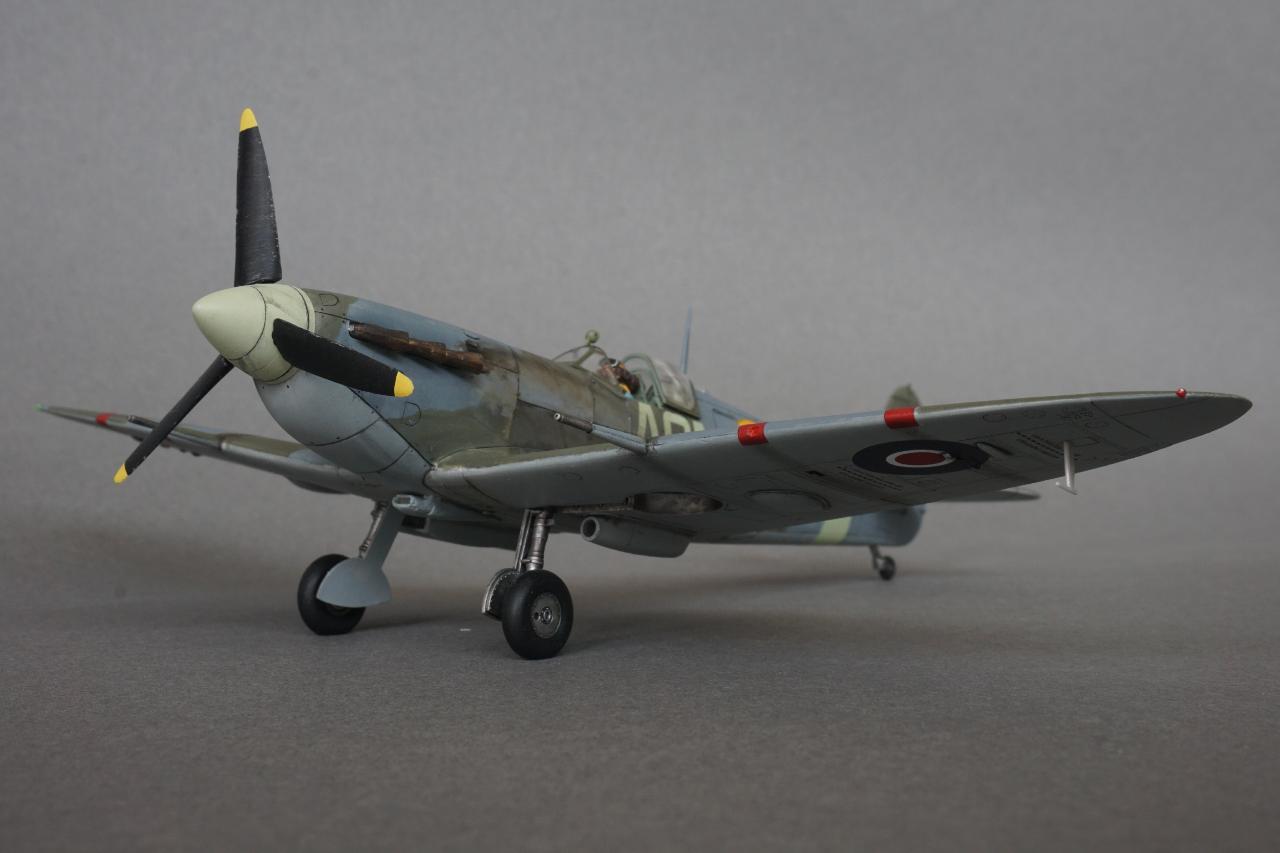 전체적인 느낌은 좋습니다. 날개는 얇으면서도 모양이 잘 살아있고 엔진 주변 곡선도 멋집니다. 그런데 스피너가 너무 두툼하게 나와서 좀 더 뾰족한 형상으로 수정해주었고 요즘 스핏파이어 킷은 대부분 조종석 쪽문이 별도 부품인 경우가 많은데 이 킷은 닫혀 있어서 고민하다가 말란 인형을 태워 주었습니다. 사막용 필터부품을 넣어주면서 원래 있던 캬뷰레이터 공기흡입구 부품을 안 넣어준 것을 거의 다 만들어서 알았습니다. 이 상태로 한참 방치했다가 최근 퍼티로 비슷하게 만들고 완성시켰습니다. 날개에 있는 기관총 총구는 기관총 결빙방지를 위한 히터 효율을 높이기 위해 탄약이 보급되면 빨간색 테이프를 붙여 막아놓는다고 해서 데칼로 덮어두었습니다.