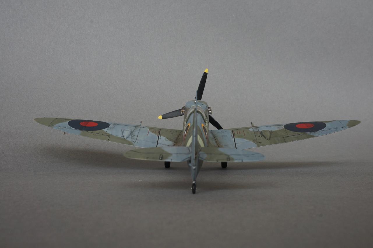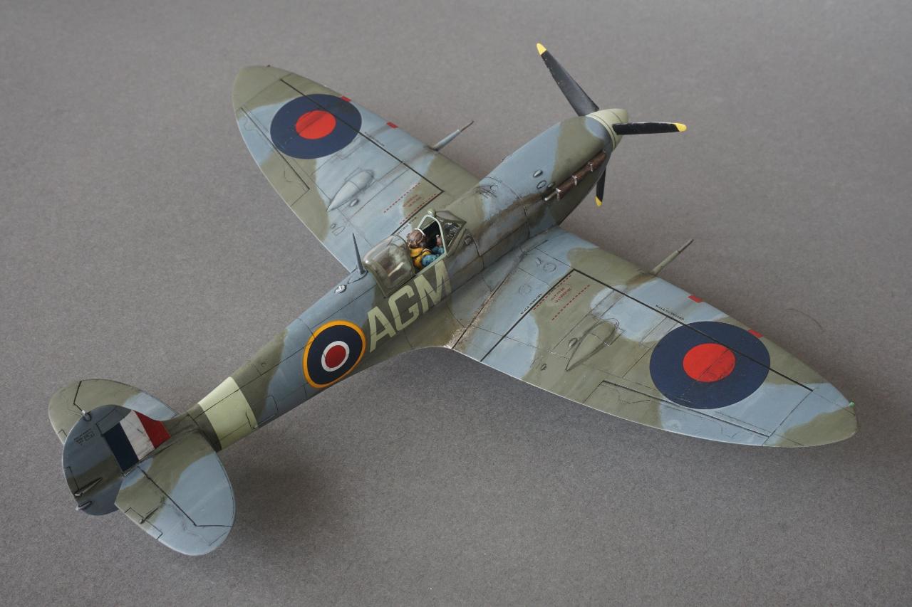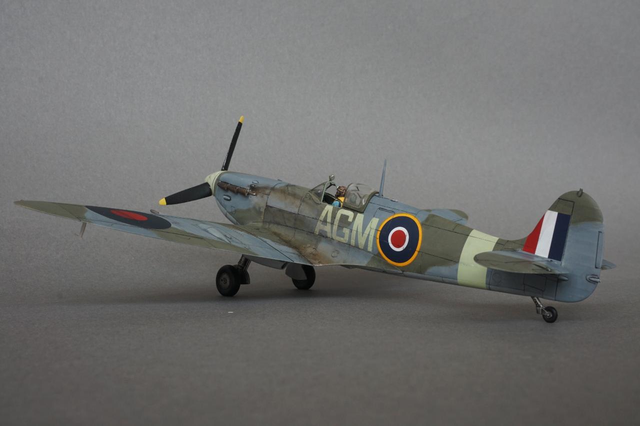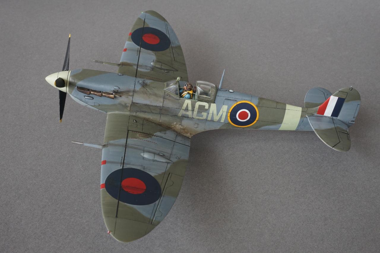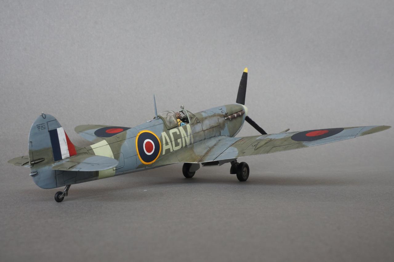 전체적인 느낌은 좋습니다. 날개는 얇으면서도 모양이 잘 살아있고 엔진 주변 곡선도 멋집니다. 그런데 스피너가 너무 두툼하게 나와서 좀 더 뾰족한 형상으로 수정해주었고 요즘 스핏파이어 킷은 대부분 조종석 쪽문이 별도 부품인 경우가 많은데 이 킷은 닫혀 있어서 고민하다가 말란 인형을 태워 주었습니다. 사막용 필터부품을 넣어주면서 원래 있던 캬뷰레이터 공기흡입구 부품을 안 넣어준 것을 거의 다 만들어서 알았습니다. 이 상태로 한참 방치했다가 최근 퍼티로 비슷하게 만들고 완성시켰습니다. 날개에 있는 기관총 총구는 기관총 결빙방지를 위한 히터 효율을 높이기 위해 탄약이 보급되면 빨간색 테이프를 붙여 막아놓는다고 해서 데칼로 덮어두었습니다.