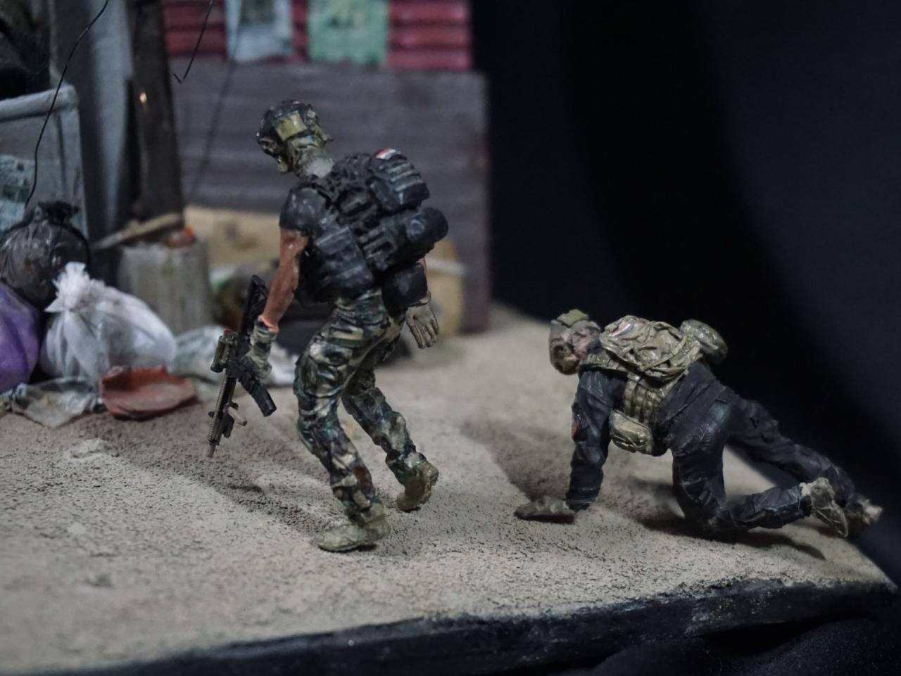 모술을 배경으로 하다보니, IS 전사와 이라크군을 등장 시키는게 좋을듯 하여, 시신과 불탄깃발, 이라크 황금사단 병사들을 배치해주었습니다.