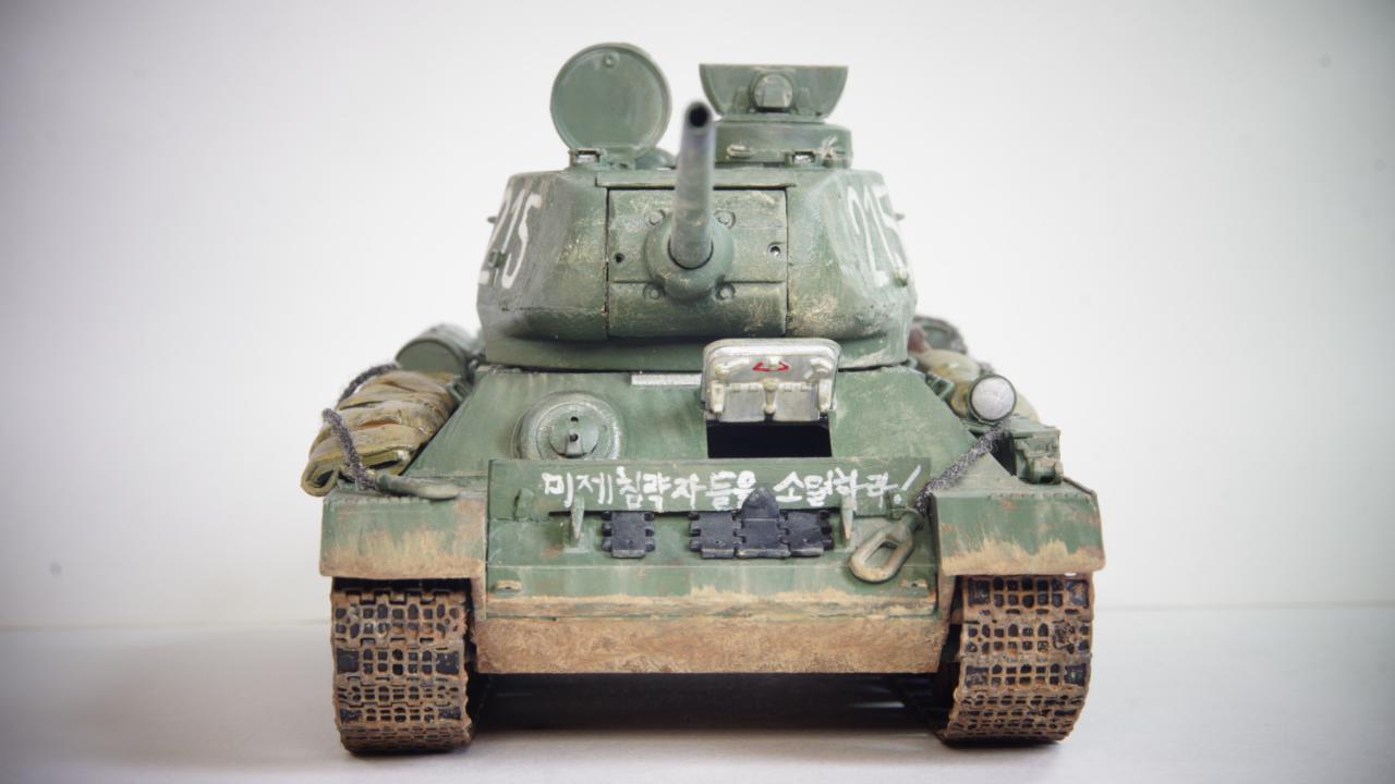 "서울 도심에 들어온 215호 112 공장형 T-34/85가 사진에 찍혔다. 그런데 이상하다. 특유의 반달 해치가 아니고 포탑도 다르다. 초기형이다. 그런데 차체는 흙받이가 부착되어져 있고 앞에 장착된 진흙이 조종수 해치로 들어오는걸 막기위한것으로 보이는 파도막이에 '미제침략자들을 소멸하라!'라는 헛소리가 적혀있다... 전차병은 소련군 전차병. 장전수 빼곤 없는것 같다. 그렇다, 사실 이건 북한에서 홍보용으로 사용하기 위한 애꿎은 2019년에도 남아있는 실제 T-34/85 어르신을 이용한 엉망의 레플리카였다. 당연히 국내외 밀리터리 전문가와 매니아들, 그리고 그 사실을 알고 있는 북한의 몇몇 사람들은 웃음이 멈추질 않았다."