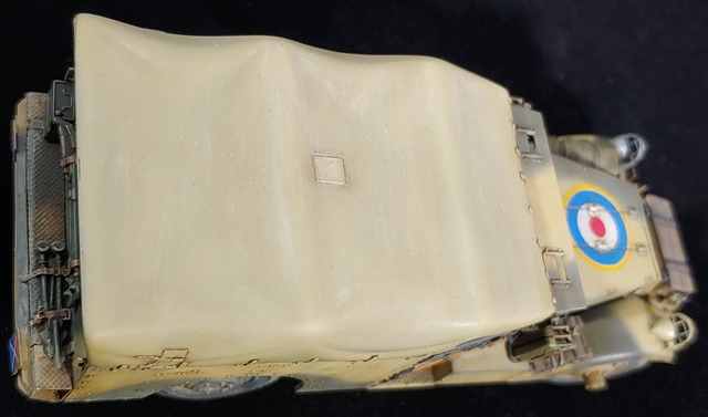 도장 설명에는 미들스톤과 시커먼 그린을 지정하고 있는데 이 시커먼 영국식 그린(회색인지 녹색인지 애매한...)을 기본으로 샌드옐로우를 섞으면서 퇴색효과를 노렸습니다만, 다 만들고 나니 회색으로 워싱한 올리브 드랍처럼 되어 버렸네요. (처음부터 올리브 드랍으로 할 걸...) 본넷 위의 항공식별마크는 연합군 공통의 별마크도 있었습니다만, 영국군스럽게 똥글뱅이로 선택하였습니다.