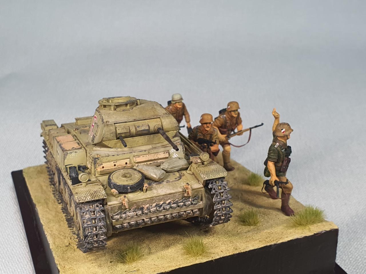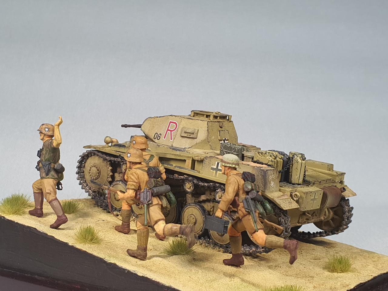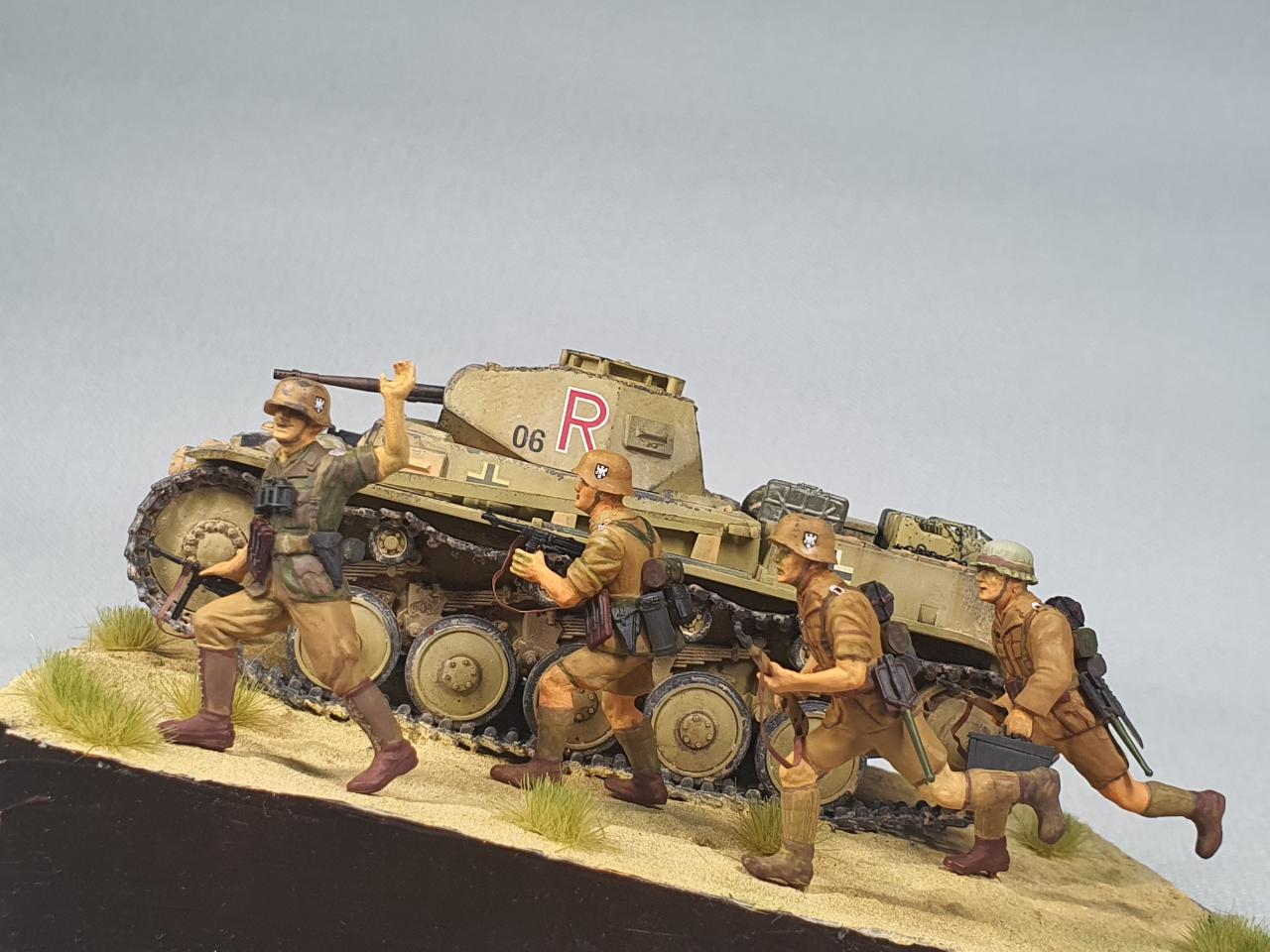 맨뒤의 보병은 북아프리카 전선에서 가끔 보이는 천으로 둘러싼 헬멧으로 교체했습니다.