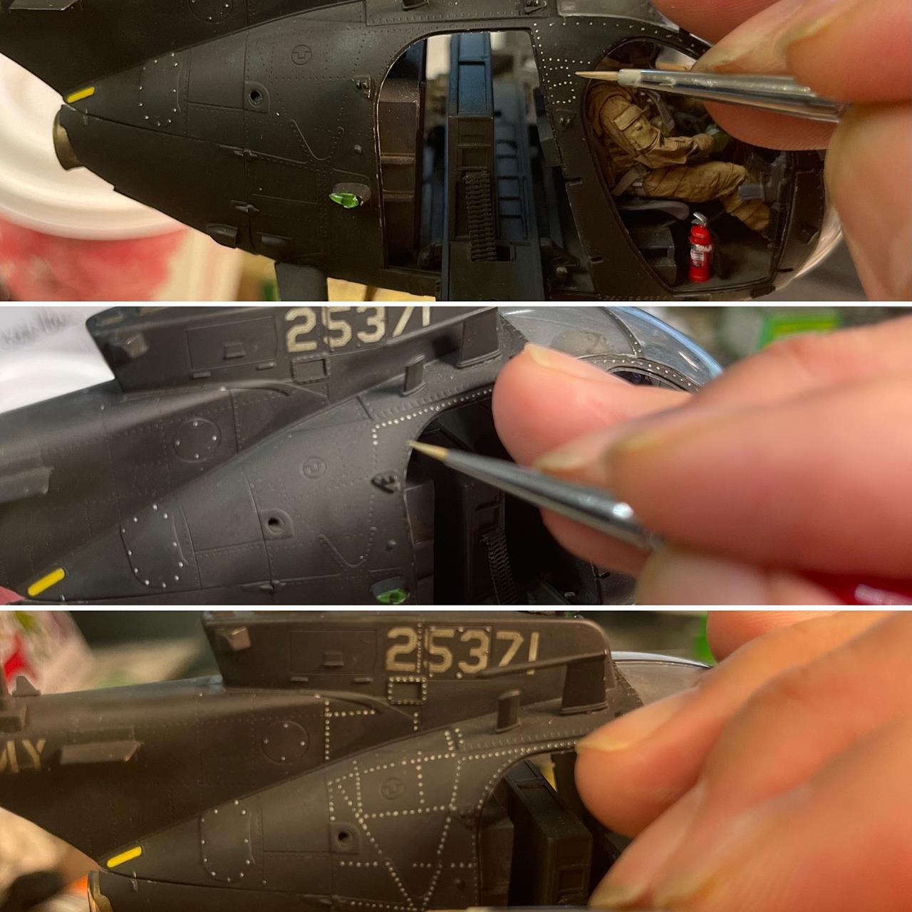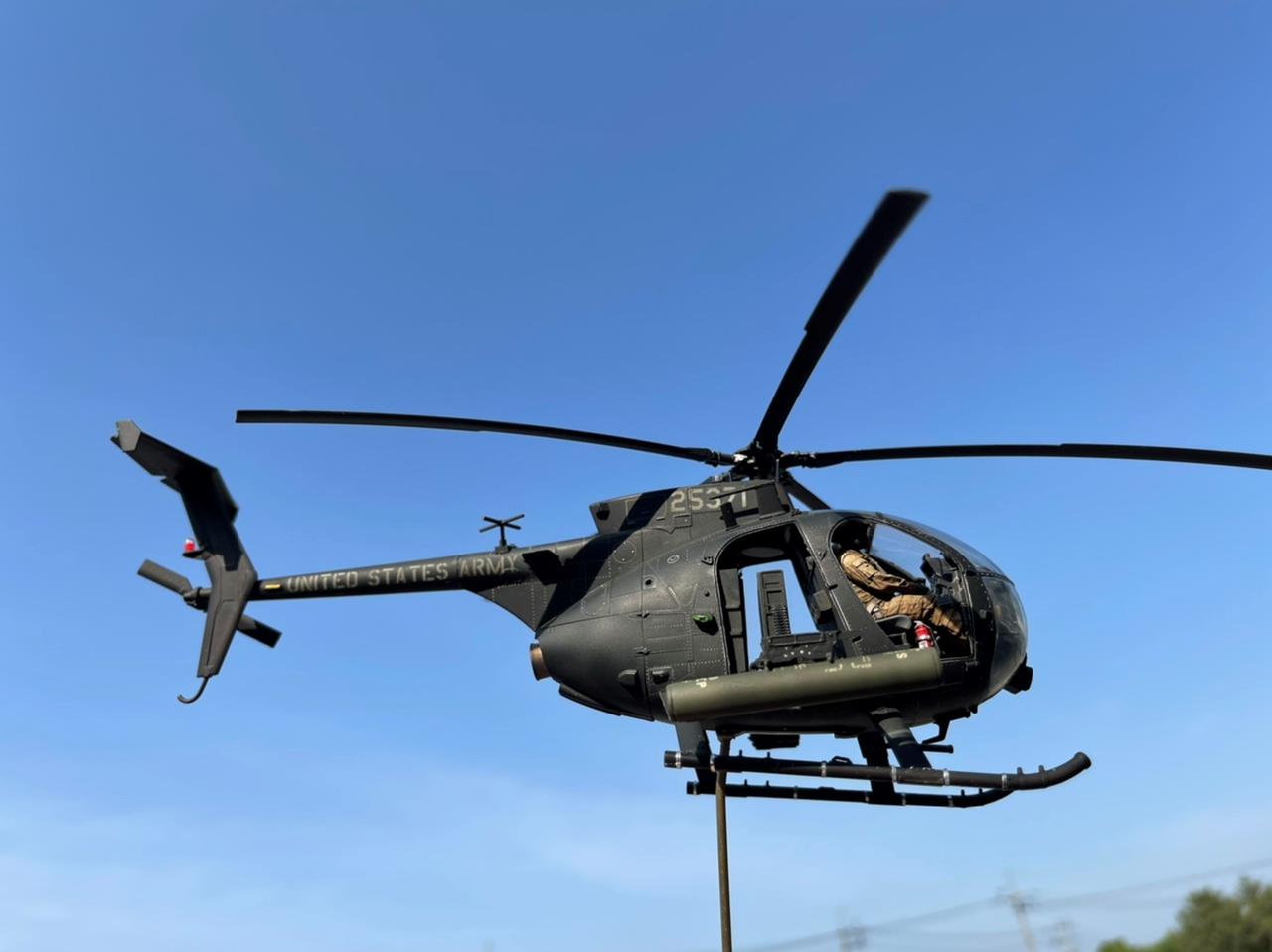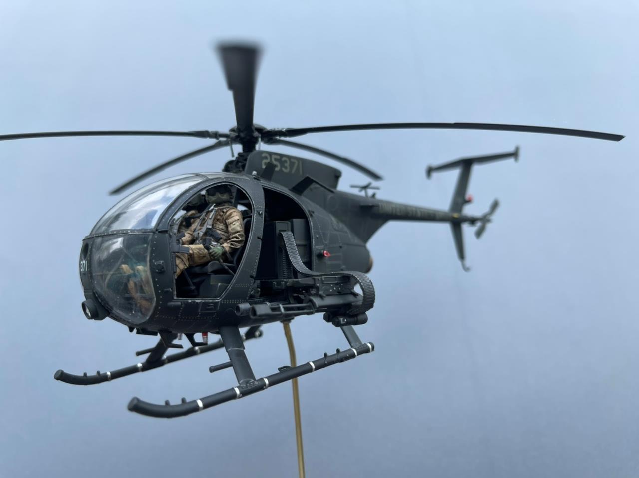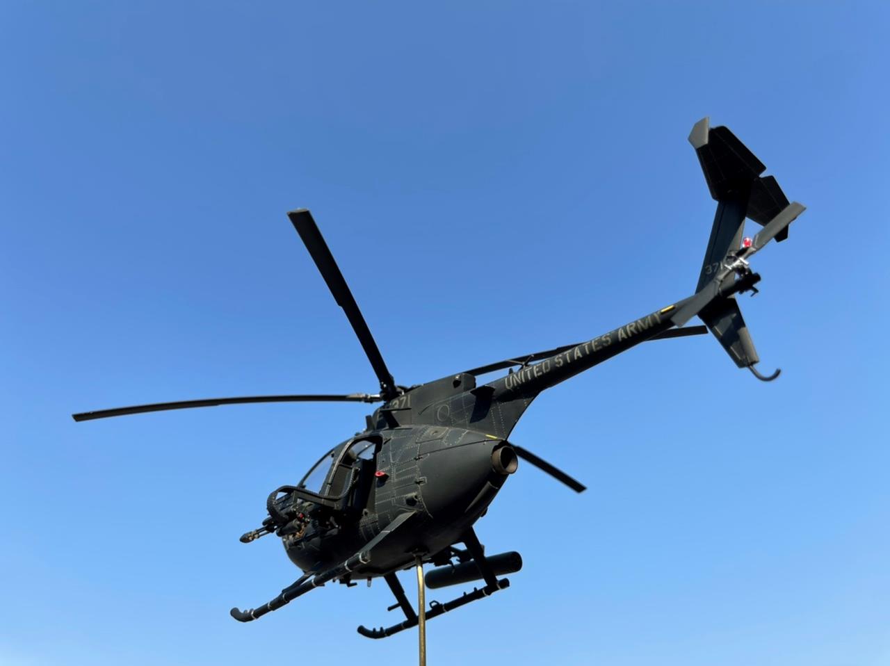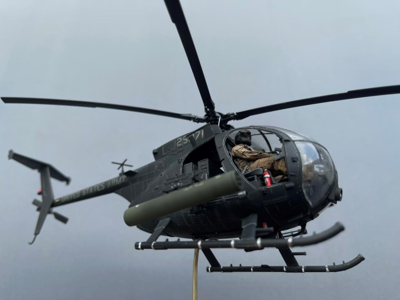 블랙호크 다운이라는 영화를 보면 작은 동체에 강격한 무장을 가지고 호위를 하다 지상지원 요청을 받으면 엄청난 화력으로 속된 말로 쓸어 버린 다고 할만큼 강한 존재감을 가지고 있는 기체입니다. 원래는 라이브 레진 사에서나온 멋진 전용 인형들을 구매하였기에 공격형인 AH-6가 아닌 동체 옆에 간이 탈것을 가지고 인원을 건물 옥상등의 좁은 공간에 신속 전개 시키는 용도의 MH-6로 작업을 진행하던중 심심해서 무장을 달아주었더니 너무 맘에들어 갑자기 공격형으로 전환 하게 되었습니다. 그래서 기체 넘버는 수송형을 마킹하고 있습니다. 다음에는 진짜 수송형도 제작해야겠습니다