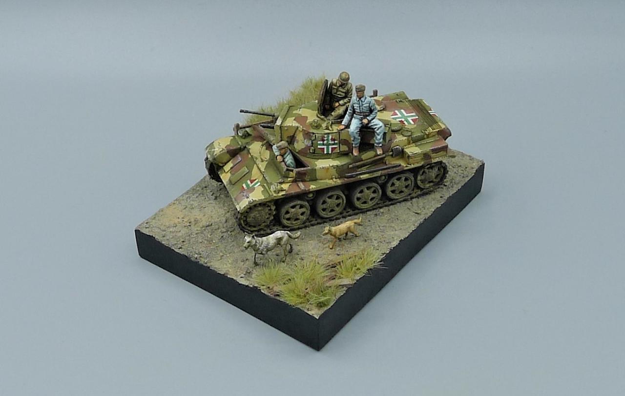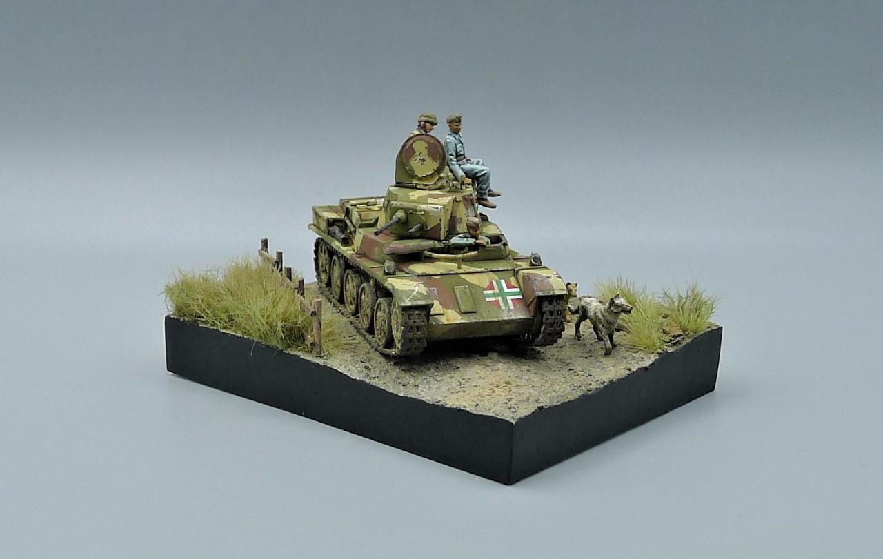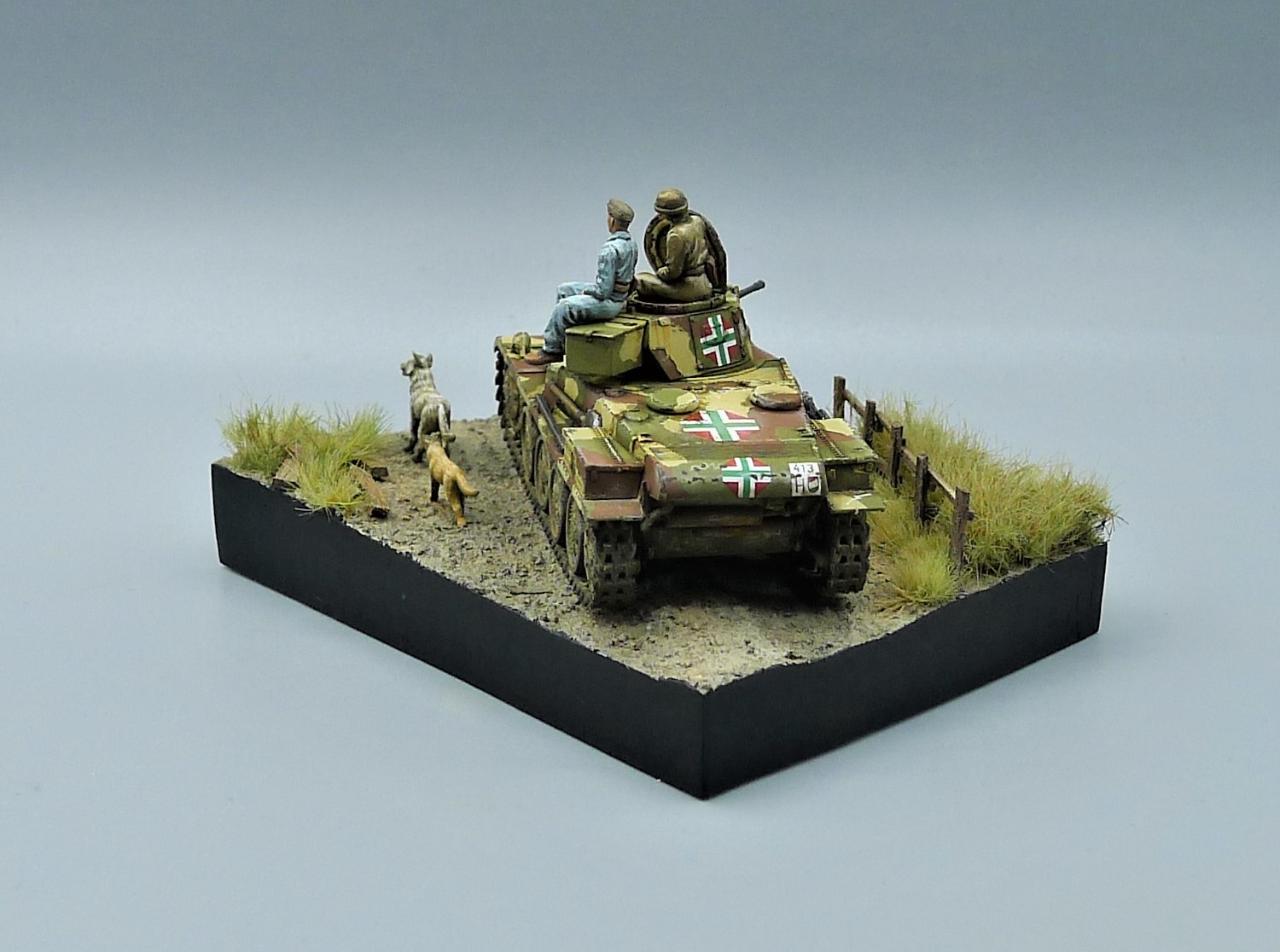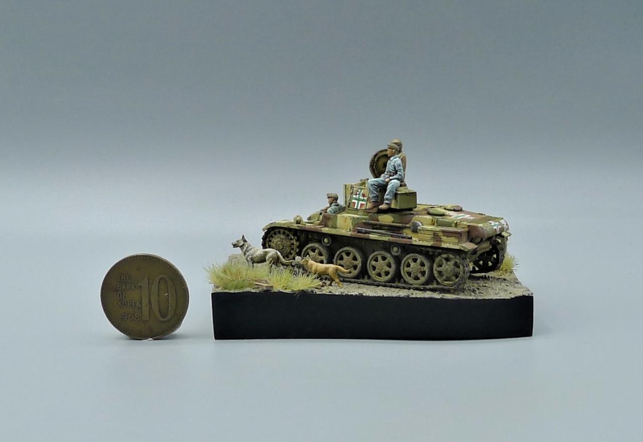 헝가리군의 Toldi II전차를 이용한 작은 비네트입니다. 전차는 IBG MODEL의 킷을 사용해주었고 레어템 그 자체인 헝가리군 전차병들은 BLACK ARMY MODELS라는 헝가리 업체의 레진 제품입니다. 인형의 조형상태가 너무좋아 무기력하고 나른한 느낌이 잘 연출되는 제품입니다. 두 마리의 개는 하나는 프레이져, 작은 개는 페가수스 제품입니다. 개 조차도 위협받지않는 저속 주행을 하며 어느 한적한길을 지나치는 설정입니다. 봐주셔서 감사합니다~!