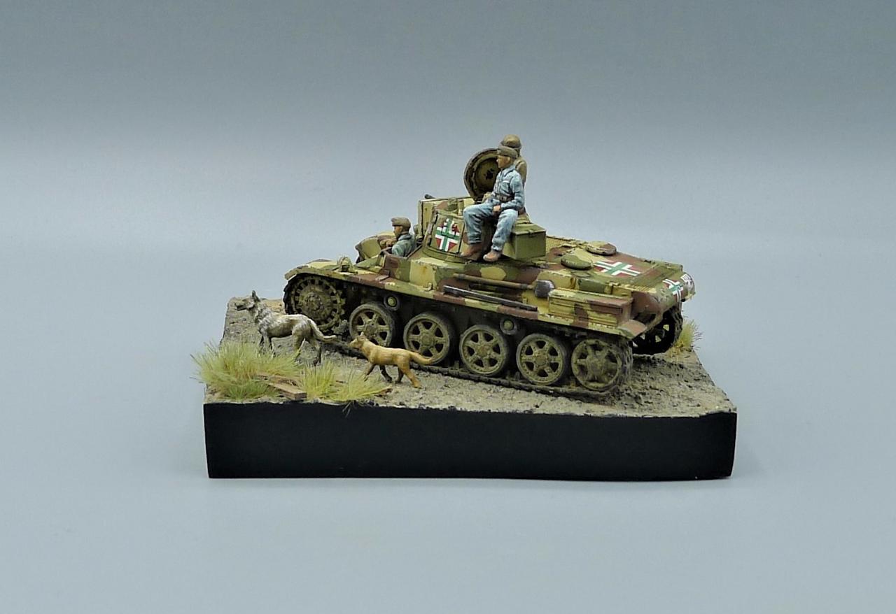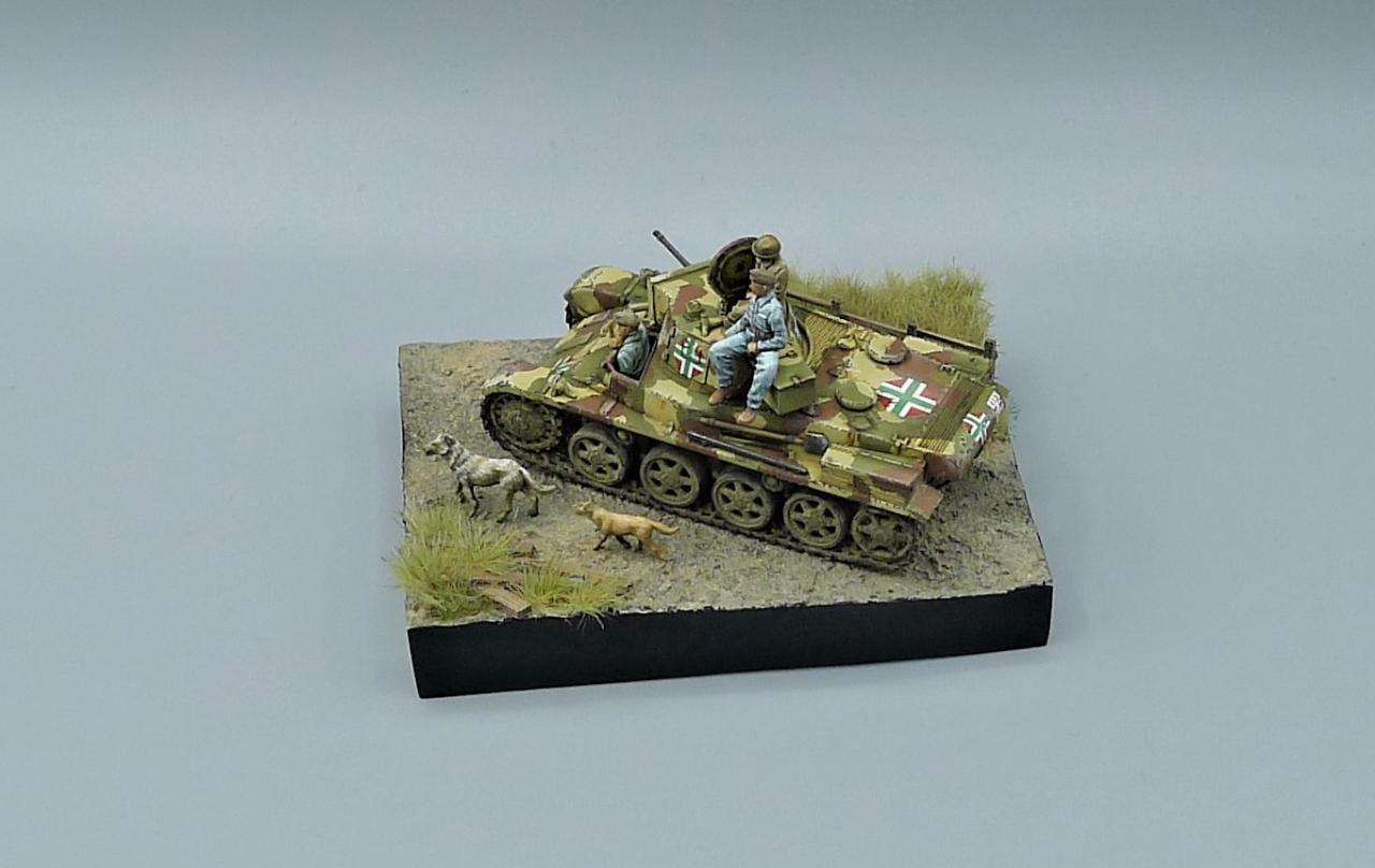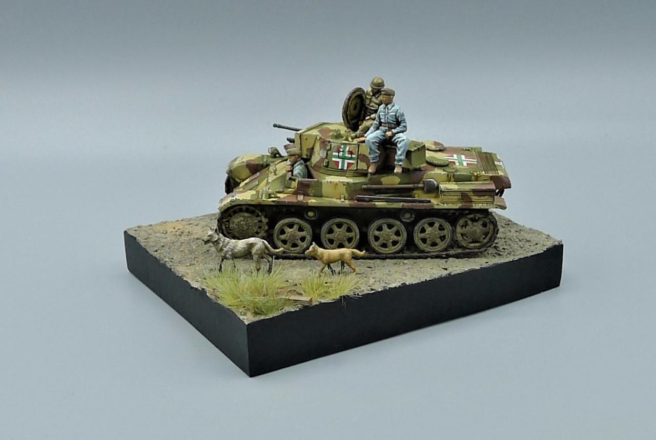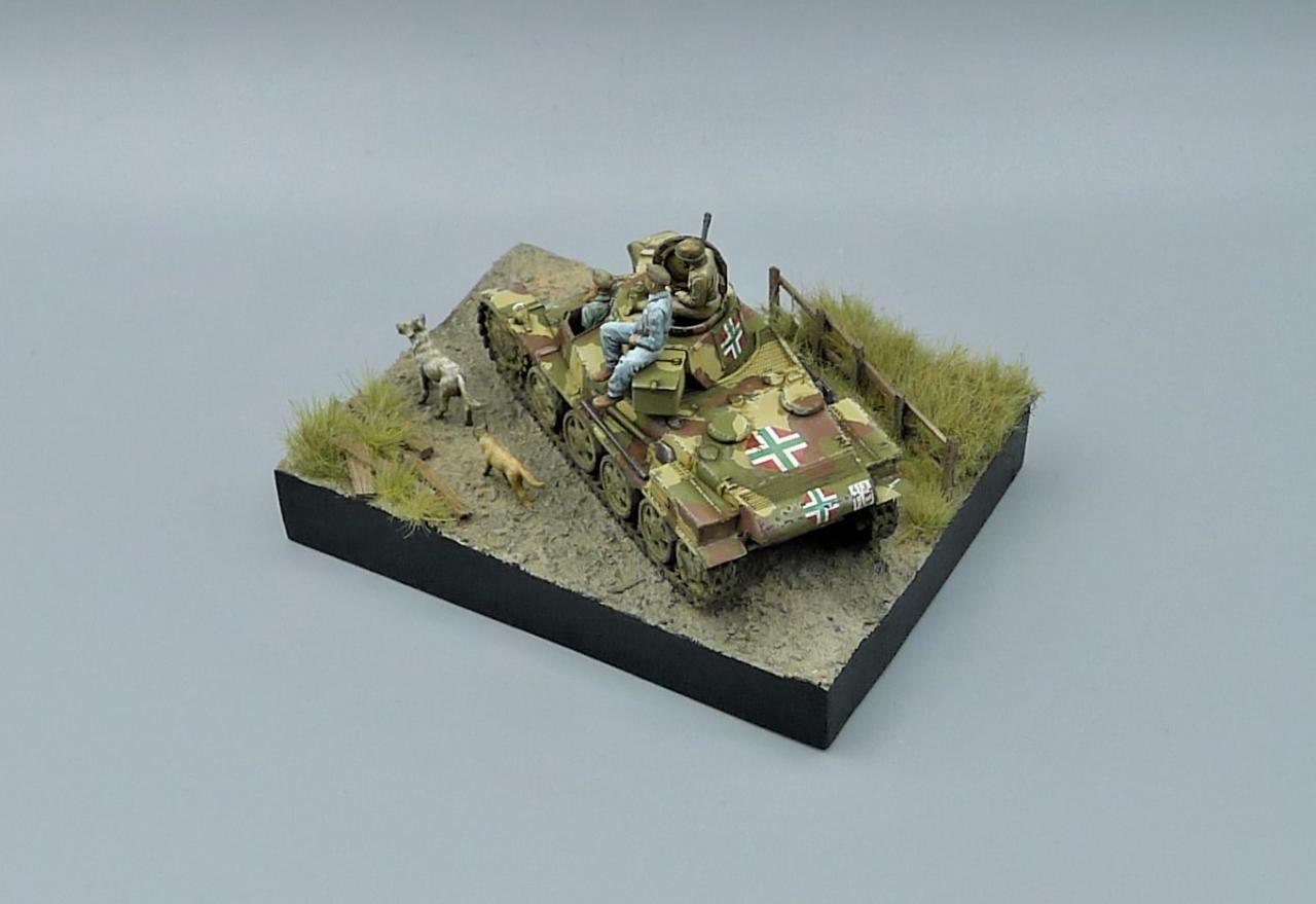 헝가리군의 Toldi II전차를 이용한 작은 비네트입니다. 전차는 IBG MODEL의 킷을 사용해주었고 레어템 그 자체인 헝가리군 전차병들은 BLACK ARMY MODELS라는 헝가리 업체의 레진 제품입니다. 인형의 조형상태가 너무좋아 무기력하고 나른한 느낌이 잘 연출되는 제품입니다. 두 마리의 개는 하나는 프레이져, 작은 개는 페가수스 제품입니다. 개 조차도 위협받지않는 저속 주행을 하며 어느 한적한길을 지나치는 설정입니다. 봐주셔서 감사합니다~!