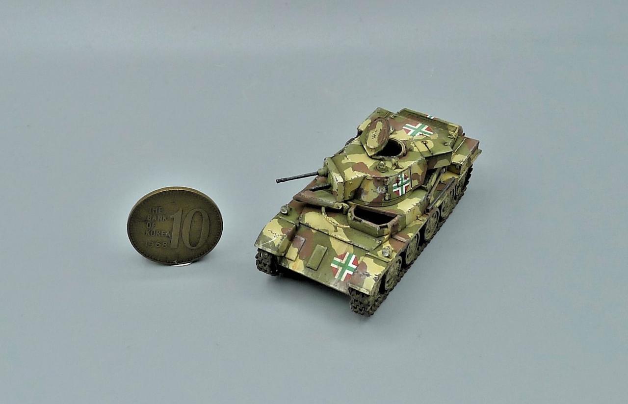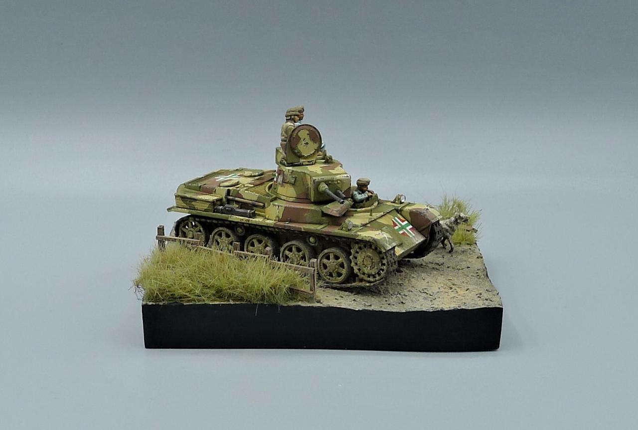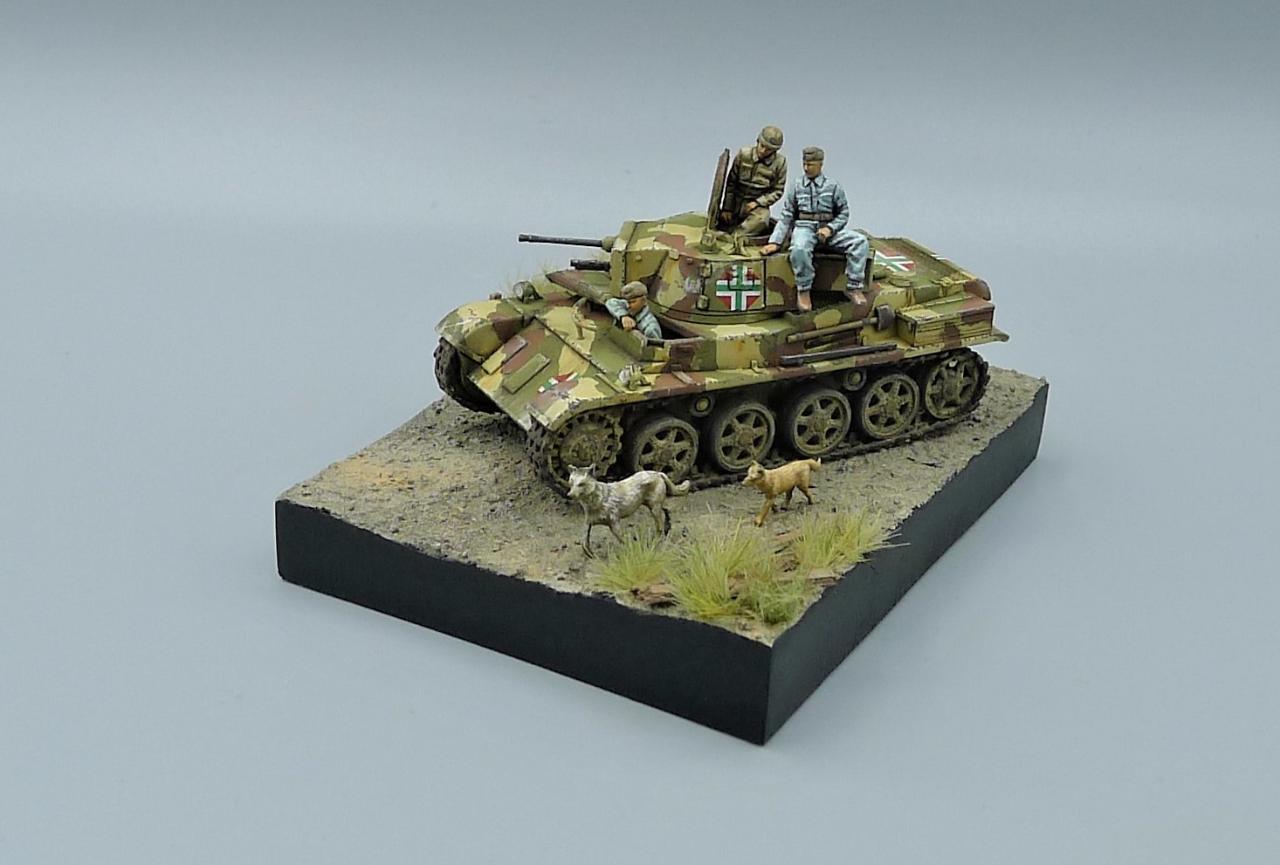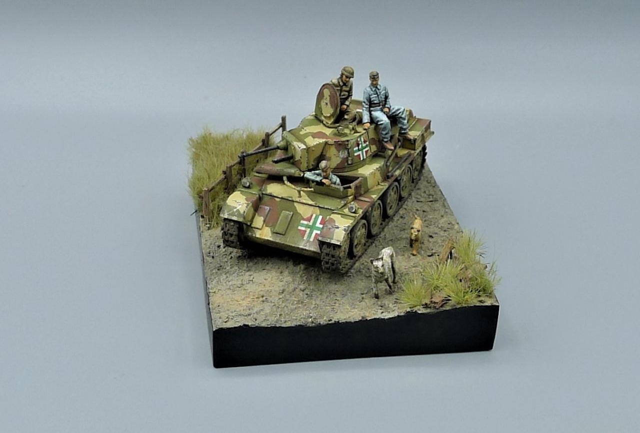 헝가리군의 Toldi II전차를 이용한 작은 비네트입니다. 전차는 IBG MODEL의 킷을 사용해주었고 레어템 그 자체인 헝가리군 전차병들은 BLACK ARMY MODELS라는 헝가리 업체의 레진 제품입니다. 인형의 조형상태가 너무좋아 무기력하고 나른한 느낌이 잘 연출되는 제품입니다. 두 마리의 개는 하나는 프레이져, 작은 개는 페가수스 제품입니다. 개 조차도 위협받지않는 저속 주행을 하며 어느 한적한길을 지나치는 설정입니다. 봐주셔서 감사합니다~!