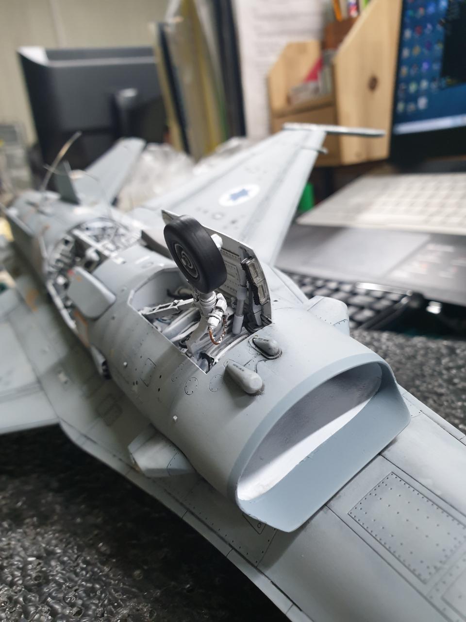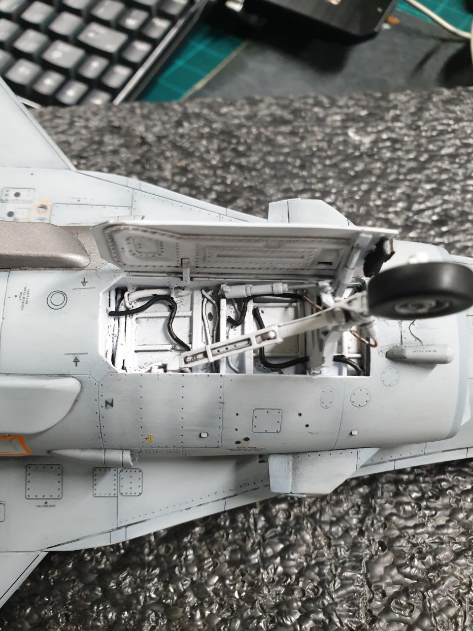 킷 자체 스트레이트 제작을 기본으로 랜딩 기어 쪽 와이어링 몇개 및 무장은 몇가지 선택 할수 있게 자석심어서 제작했습니다.
