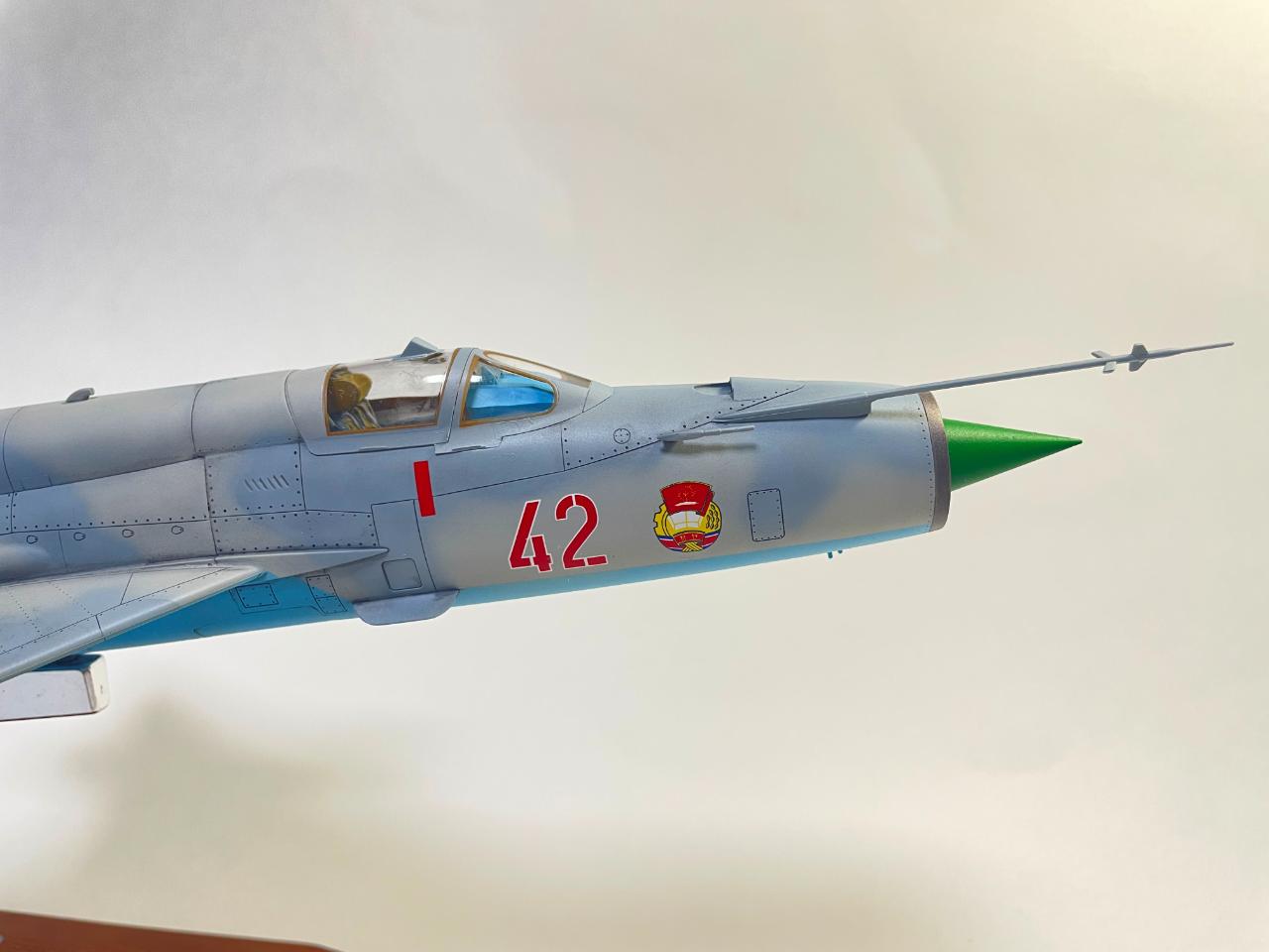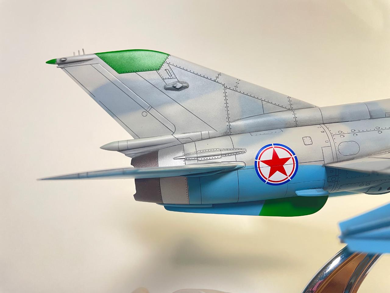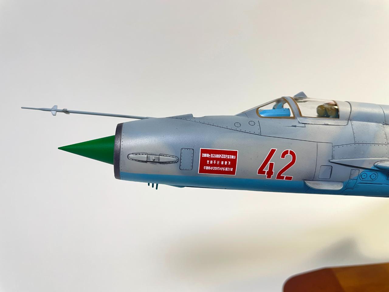 원래는 청새치 도색으로 유명한 아카데미 1/48 미그-21 MF 폴란드 공군 한정판이었는데 2016년 북한 원산에 있었던 에어쇼에 참가한 북한 공군의 MIG-21 도색에 이끌려 폴란드 공군사양에서 북한 공군 사양으로 억지로 바꿔 만들었습니다. 영상을보니 당시 파일럿이 젊은 여성분이었고 착륙시 사고가 예상될정도로 꽤나 거칠게 착륙해서 인상이 깊게 남았던 기체였습니다.