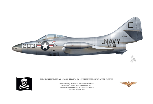 그래서 파일럿 이름, LT. L.M. Cauble 을 찾아봤는데, 이 분 2차대전때 참전해서 헬캣으로 필리핀에서 제로기 격추기록까지 있습니다. 이후 여러 비행단에서 근무했고, 2000년에 돌아가셨네요. VF-61 졸리로저스에는 1950~1952년에 근무했습니다. 그 당시 몰았던 기체입니다.