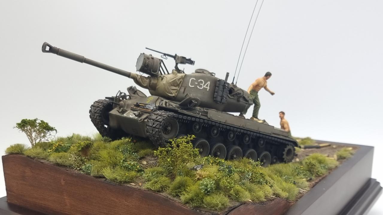 타콤 M46 제품을 사용했고 MJ미니어쳐 별매품을 적용해서 완성하였습니다. 기관총은 폰토스 별매품을 사용했습니다. 인형은 이대영선생님 원형의 하비팬 제품을 사용했고 하나는 머리만 교체해 주었습니다. 탄피는 AFV클럽의 별매품이고 탄통은 비슷하게 자작해보았습니다. 고지전 당시 곡사포로 쓰였던 M46전차와 탄피가 수북히 쌓여있는 모습을 만들어 봤습니다만. 분위기가 한국전쟁 자료사진의 일반적인 느낌과는 다른것 같아 아쉬움이 남습니다. ^^