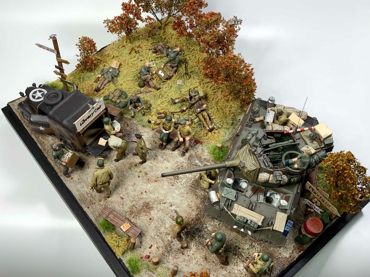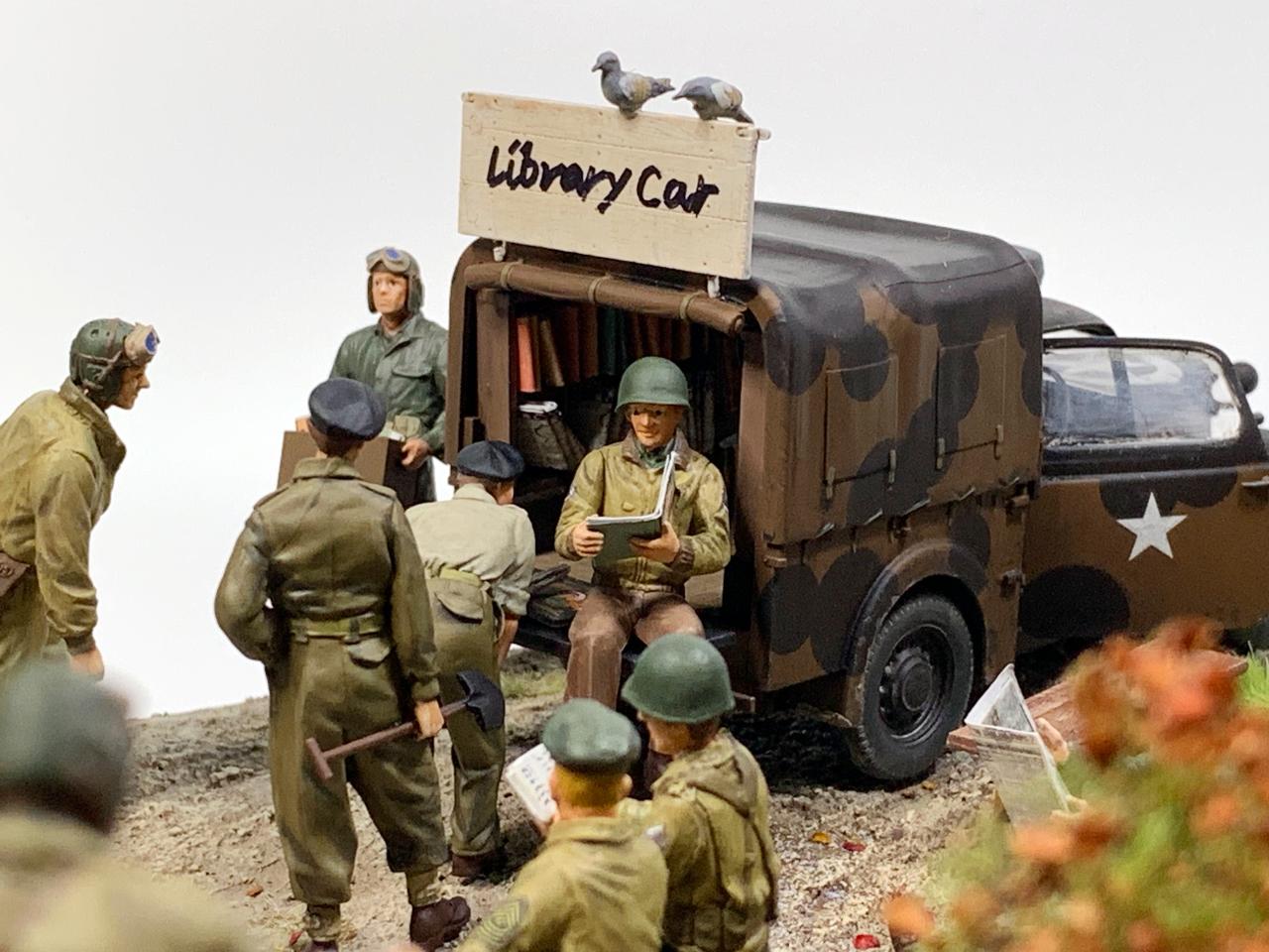 "네덜란드 내 어딘가, 최전선과는 조금 떨어진 재정비구역, 삼거리 교차로에서 움직이는 깜짝 도서관(Library Car)이 등장합니다. 제 각각 휴게하던, 지나가던 병사들은 그간 읽고싶었던 책이나 신문을 꺼내들어 전선에서 받은 스트레스를 잠시 잊습니다. 책을 읽는 동안엔 세계대전임을 잠시 잊고 평화롭게 마음을 가다듬습니다."