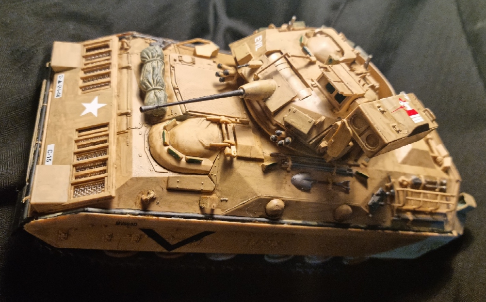 과노출돼 약간 흐릿하지만 M3 브래들리의 특징을 잘 보여주는 사진입니다. V 마크는 영국 워리어에서 가져왔습니다. 가격은 30% 할인가로 만원대 초중반에 구입했습니다, 데칼이 부족한 것 외로 만족스런 품질이었습니다.