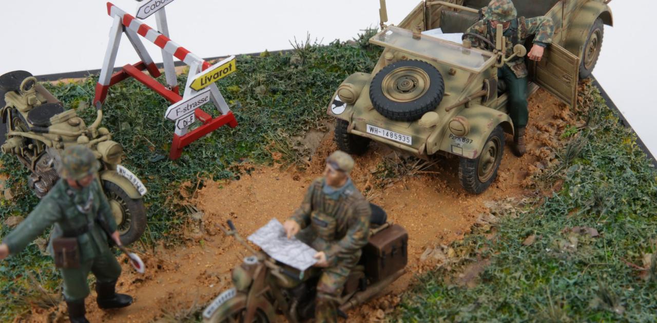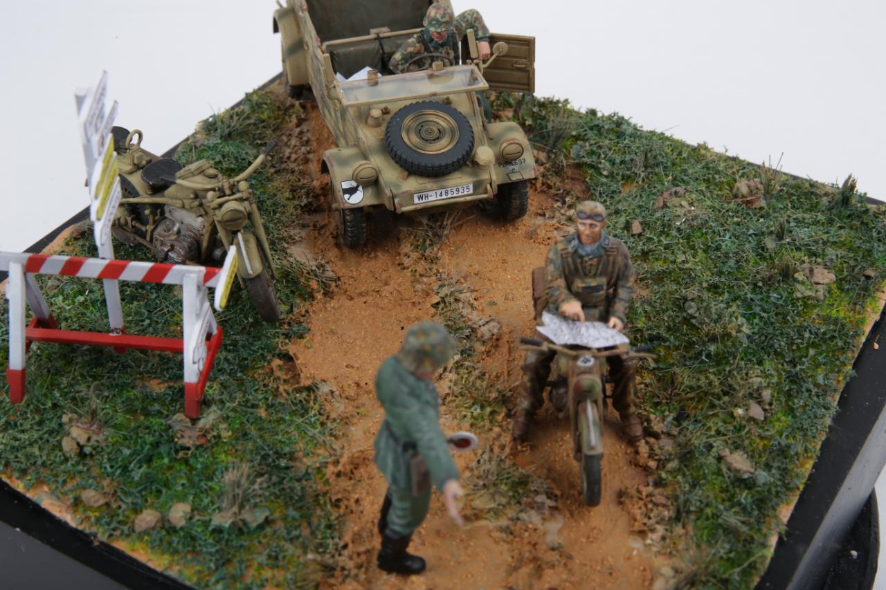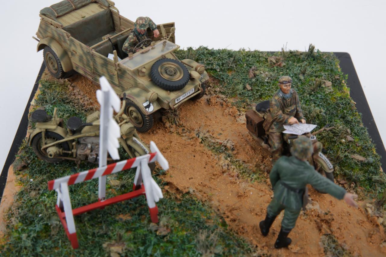 타미야 오토바이 전령세트와 타미야 퀴벨바겐, 88mm Flak36/37 키트안에 있는 오토바이와 전령병을 제작하여 디오라마를 만들어 봤습니다.