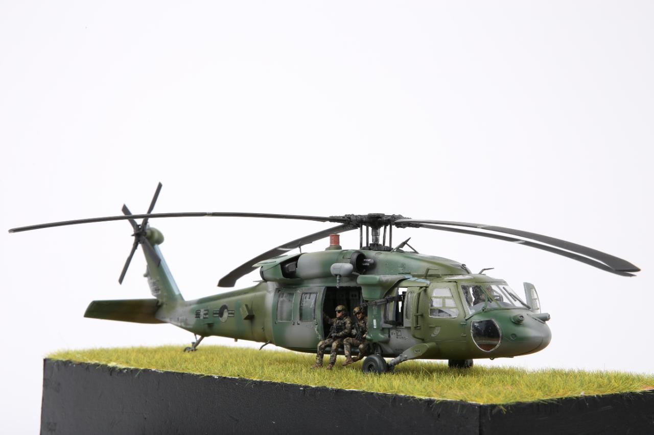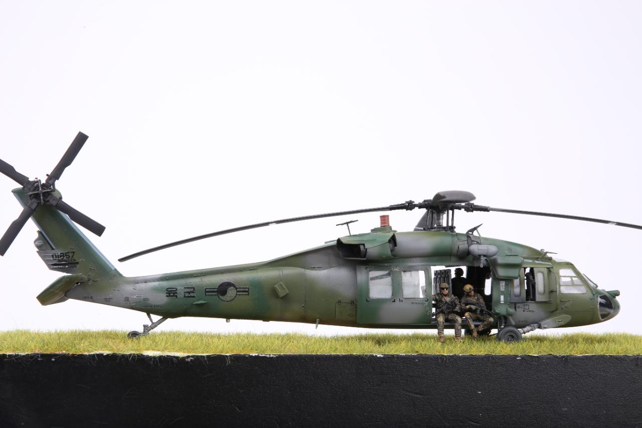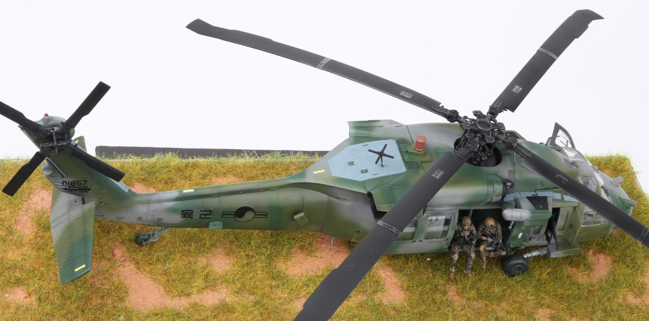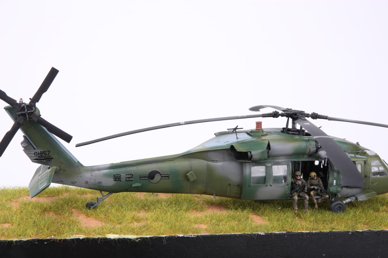 안녕하세요. 이번 작품은 아카데미과학의 대한민국 육군 UH-60P와 한미연합사단의 공중침투를 위한 디오라마입니다. 얼마전 아카데미과학의 1/35 블랙호크를 제작하였는데 크기는 작아 조립에는 그다지 어려움은 없었지만 디테일은 1/35 만큼 훌륭하다고 생각됩니다. 주 로터에 소형모터를 장착하여 모터축이 바로 날개에 접합 하니 회전이 안정적이라 좋았습니다.