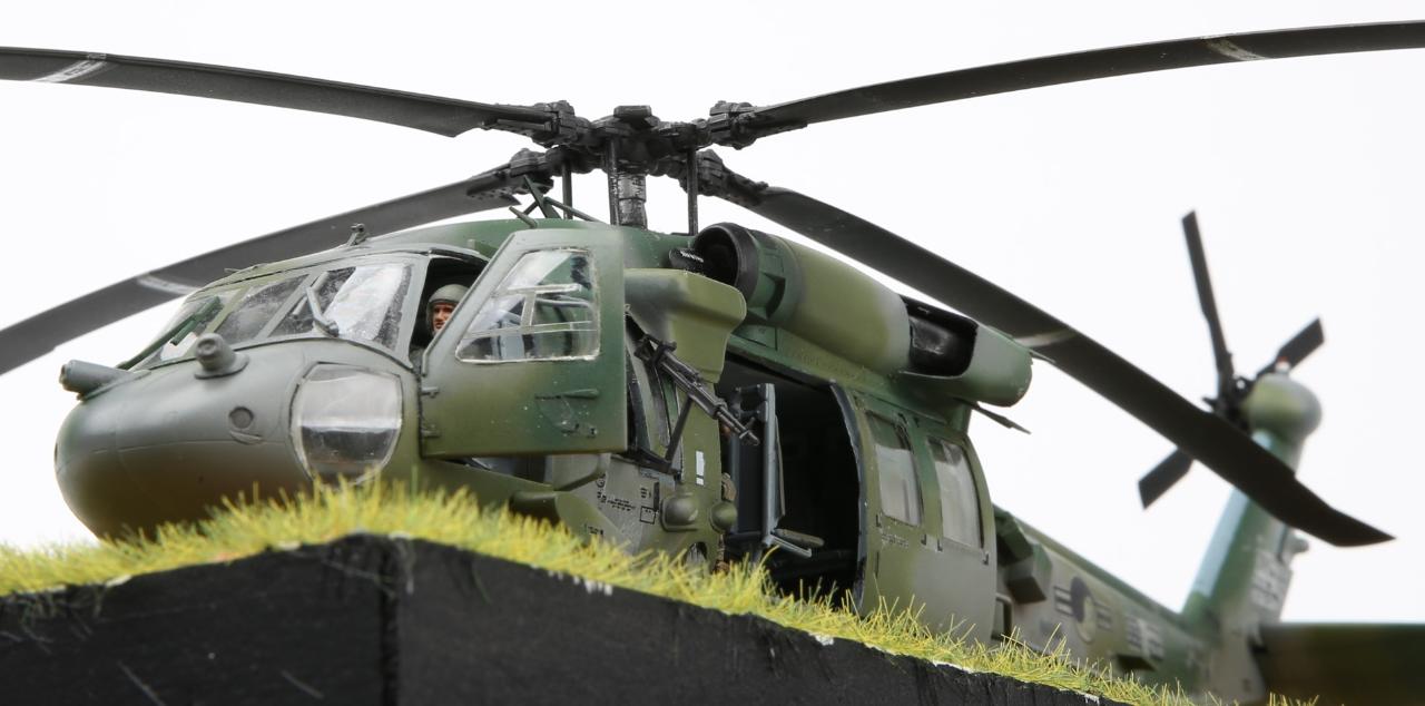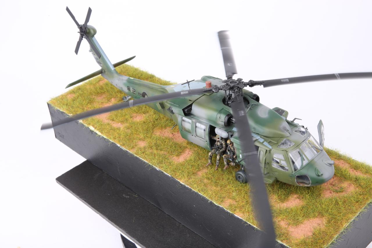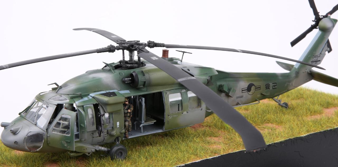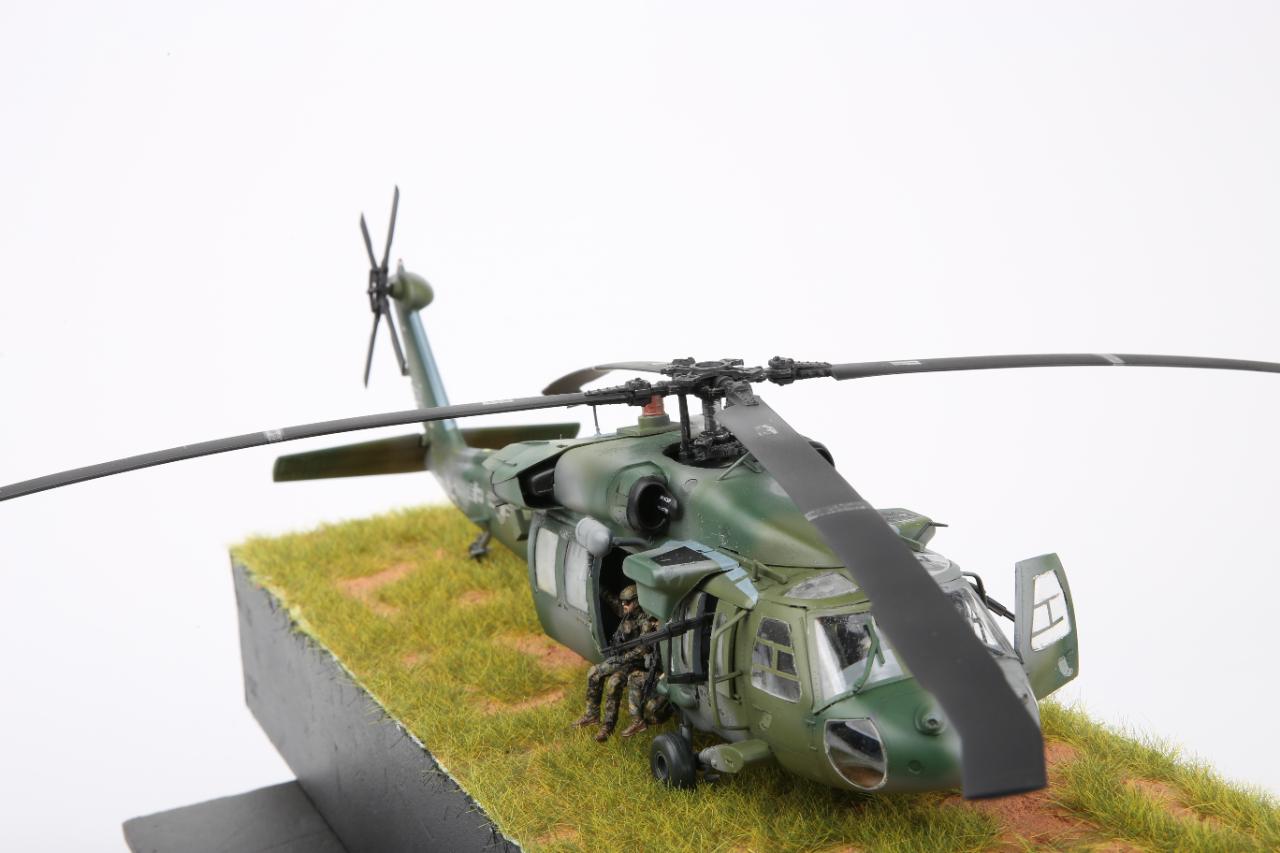 안녕하세요. 이번 작품은 아카데미과학의 대한민국 육군 UH-60P와 한미연합사단의 공중침투를 위한 디오라마입니다. 얼마전 아카데미과학의 1/35 블랙호크를 제작하였는데 크기는 작아 조립에는 그다지 어려움은 없었지만 디테일은 1/35 만큼 훌륭하다고 생각됩니다. 주 로터에 소형모터를 장착하여 모터축이 바로 날개에 접합 하니 회전이 안정적이라 좋았습니다.