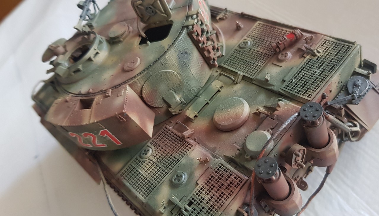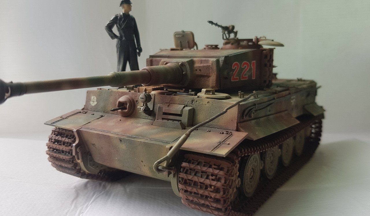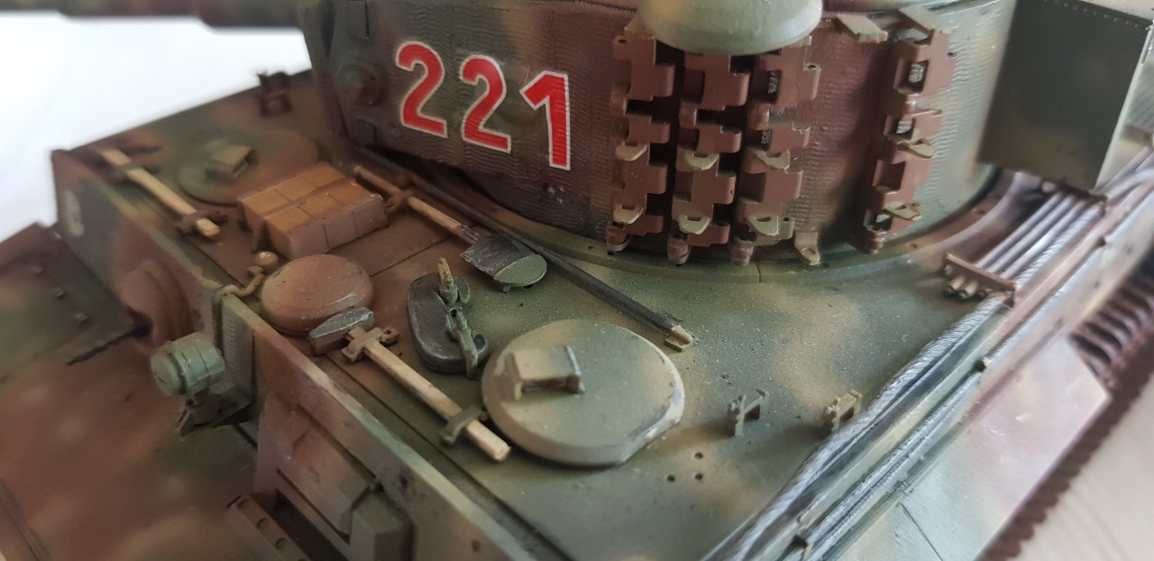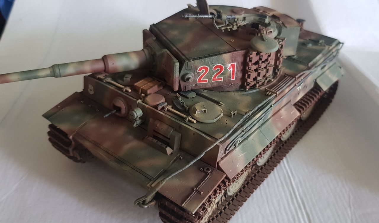 레이필드 티이거 후기형입니다. 가동식 트랙에 가동식 토션바인데 맨 앞과 뒤는 고정하였습니다. 제품의 품질은 대체로 만족합니다. 타미야 아크릴 3색에 키트에 포함된 찌메르팅도구와 모델링페이스트로 찌메르팅 직접 하였습니다. 모델링페이스트는 조금씩 또 수정작업하기에 용이했습니다.
