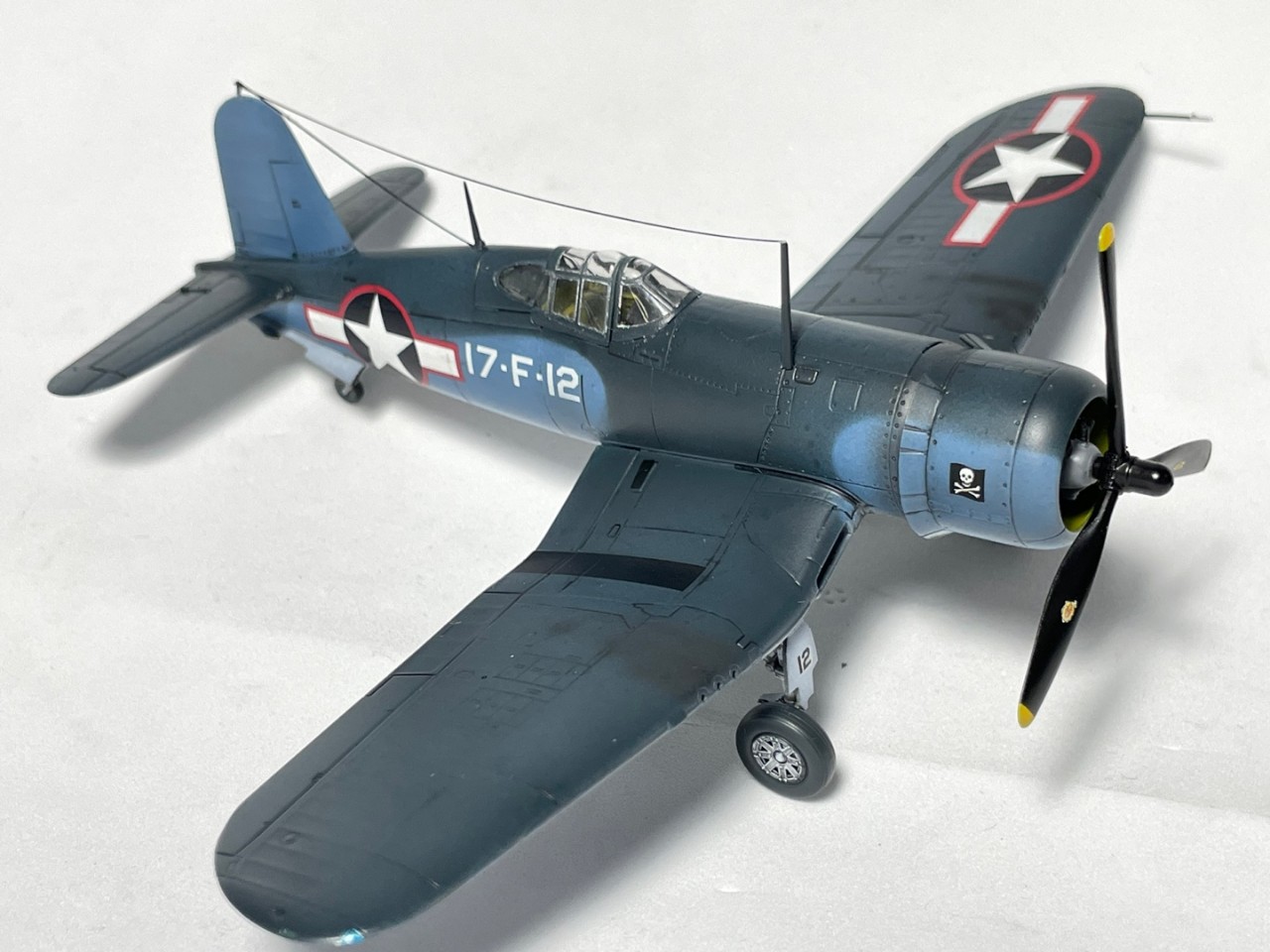 졸리로저스는 거의 프로토타잎부터 운용을 했던 모양입니다. 사실 이 기체 이전에 캐노피 천정부가 볼록하지 않은 형태의 캐노피가 장착된 기체를 창단시 운영을 했었는데, 이는 실제 항모는 타지 않고 창단 후 훈련하는 용도로 사용되었던거 같습니다. 본 기체부터 USS 벙커힐에 탑재되어 실전에 투입되고 착함문제로 인해 곧 물방울 모양의 캐노피로 개량된 F4U-1A 형으로 교체가 됩니다.