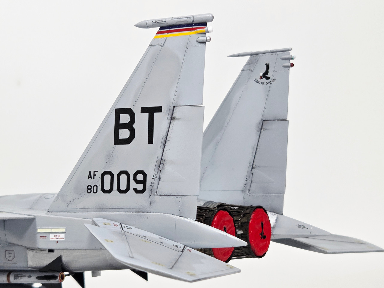 사실 제작 중간 고이케 시게오의 하세가와 1/48 F-15C 박스아트에 그려진 제1전술전투비행단 ("FF")의 F-15C로 제작할까도 했지만, 키트에 포함된 황변데칼은 복구불가 수준이었습니다. (여담이지만 어릴적 처음본 고이케 시게오의 F-15C 박스아트는 충격 그 자체였습니다.) 제공형 F-15C가 원래 심심한 도장이기도 하지만, NATO 최전방 공군기지의 엄체호에서 대기하는 "BT"의 F-15C도 실전적 느낌이 들면서도 나쁘지 않아보입니다.