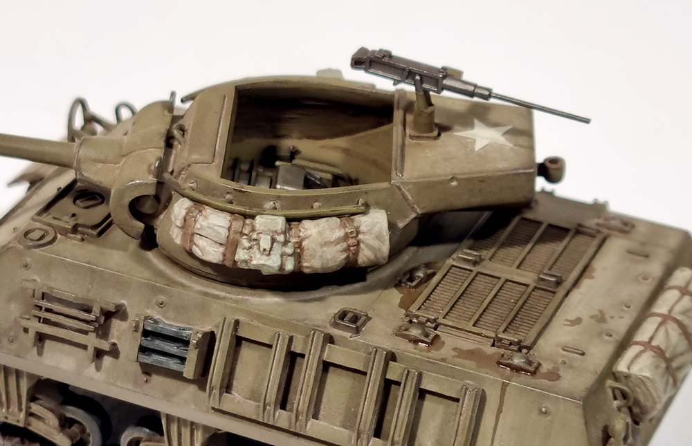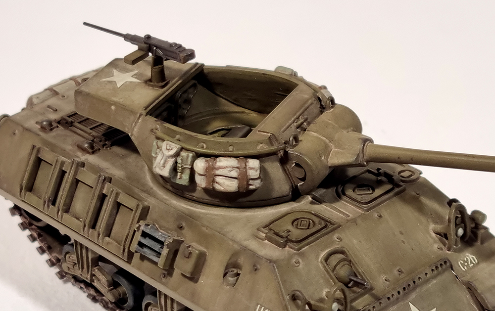 수정한 곳이 있는데, 차체 전면의 둥그스름한 중기형 트랜스미션 커버를 다소 각이 진 후기형 트랜스미션 커버로 모양을 바꾸었습니다. 그외 포탑 주변의 배낭들도 여기저기서 비슷하게 생긴 것들로 구해다 달았습니다.