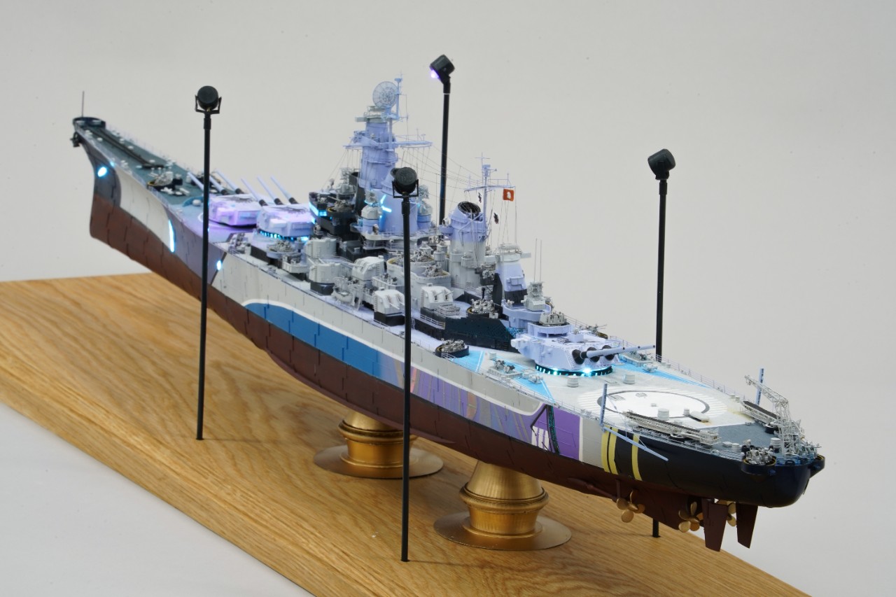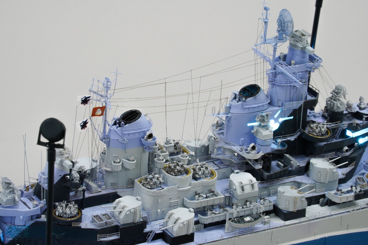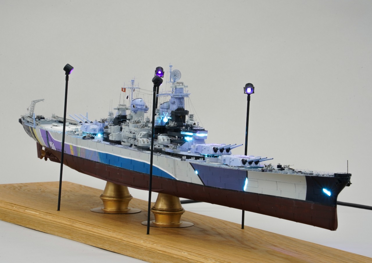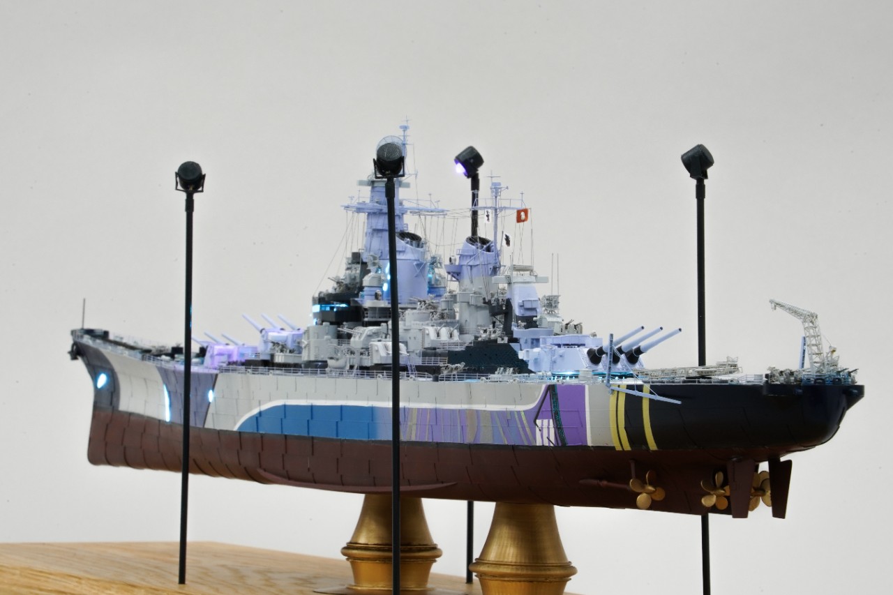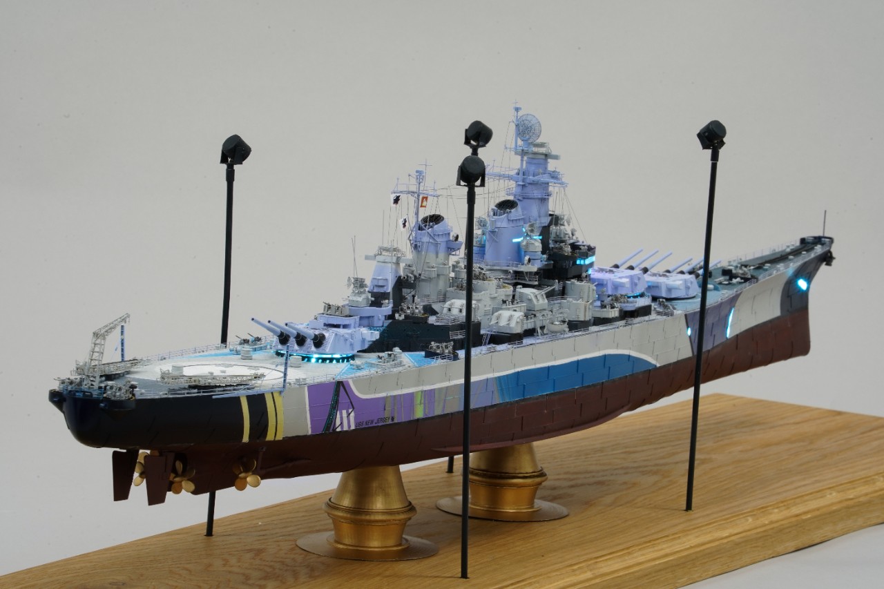 이번 작품은 world of warship과 벽람항로의 콜라보를 통해 나온 미국 9티어 전함 아이오와의 벽람항로 뉴저지버전 전용위장입니다. 개인적으로 좋아하는 배이고자 캐릭터라 작년부터 깨작대며 올 초에 완성, 하비페어에 들고갔었네요. 킷은 베리파이어의 1/350 뉴저지 킷에 동사 미주리 전용에칭을 베이스로 하였고 연장 오리콘은 벙커스튜디오의 제품을, SK-2레이더와 주포 사통장치는 중국의 3D프린팅 업체의 제품을 사용했고, 기타 자잘한 자투리 에칭등등을 사용하고, 선체 디테일이 많이 아쉬워 용접선은 전부 파고 양각으로 심어줬습니다. 베이스는 어포던스에 주문제작하였습니다.