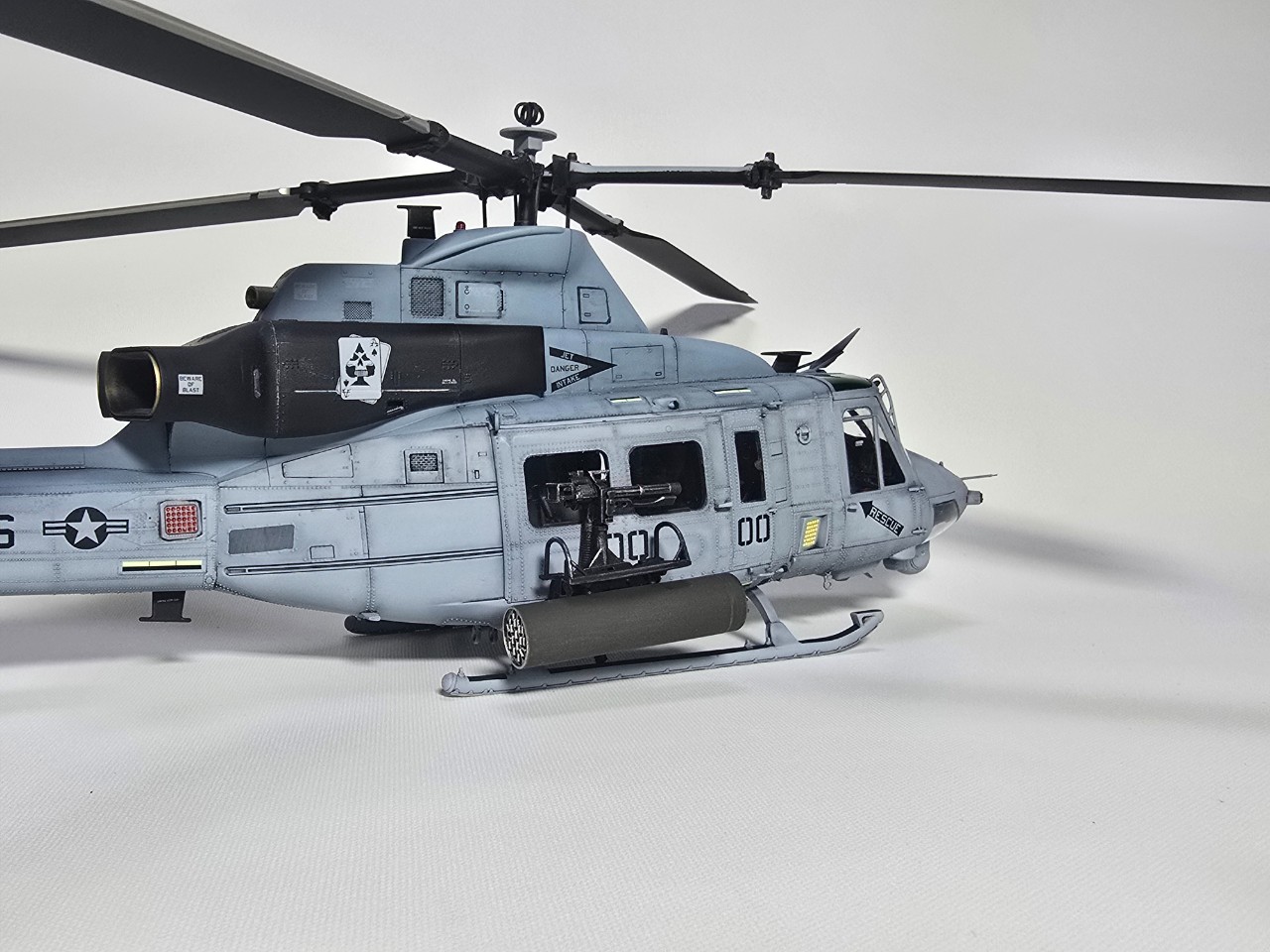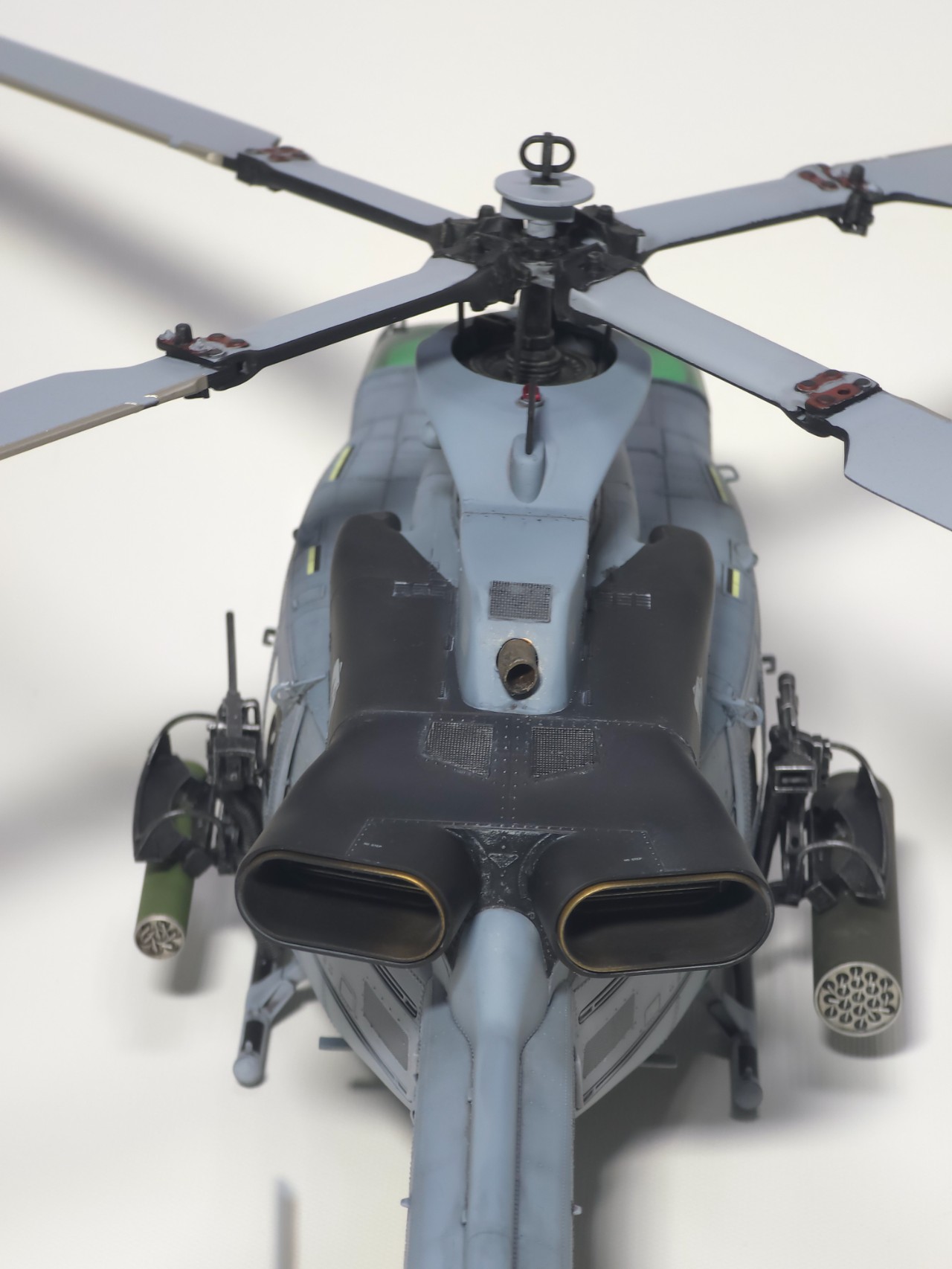 플레어 2종 앞,뒤로 박아주고 테일로터 아웃풋 샤프트 은색 도색, 전,후방 미사일경보기 유광 클리어 처리 했습니다.