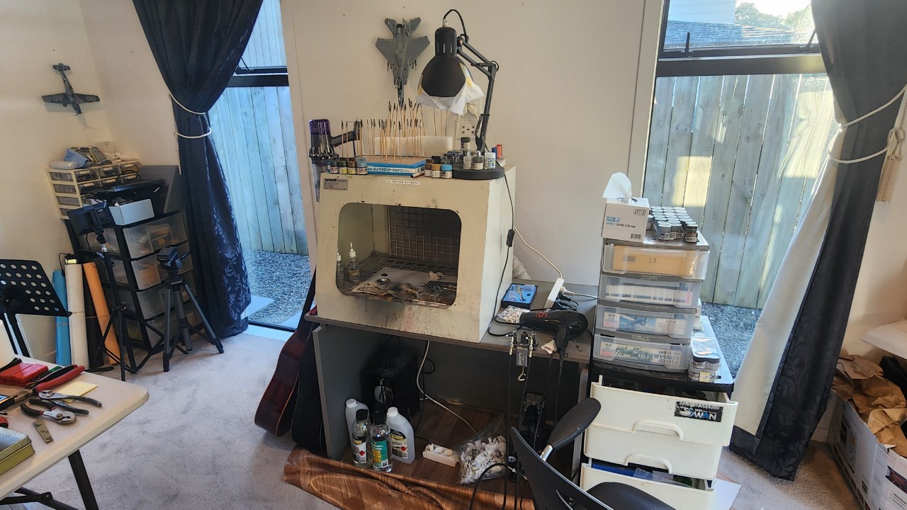 스프레이 부스와 도료 보관함입니다. 대부분 군제락카입니다. 에어브러쉬는 리치펜 2호 두개와 이와타 3호 한개를 쓰고 있습니다.