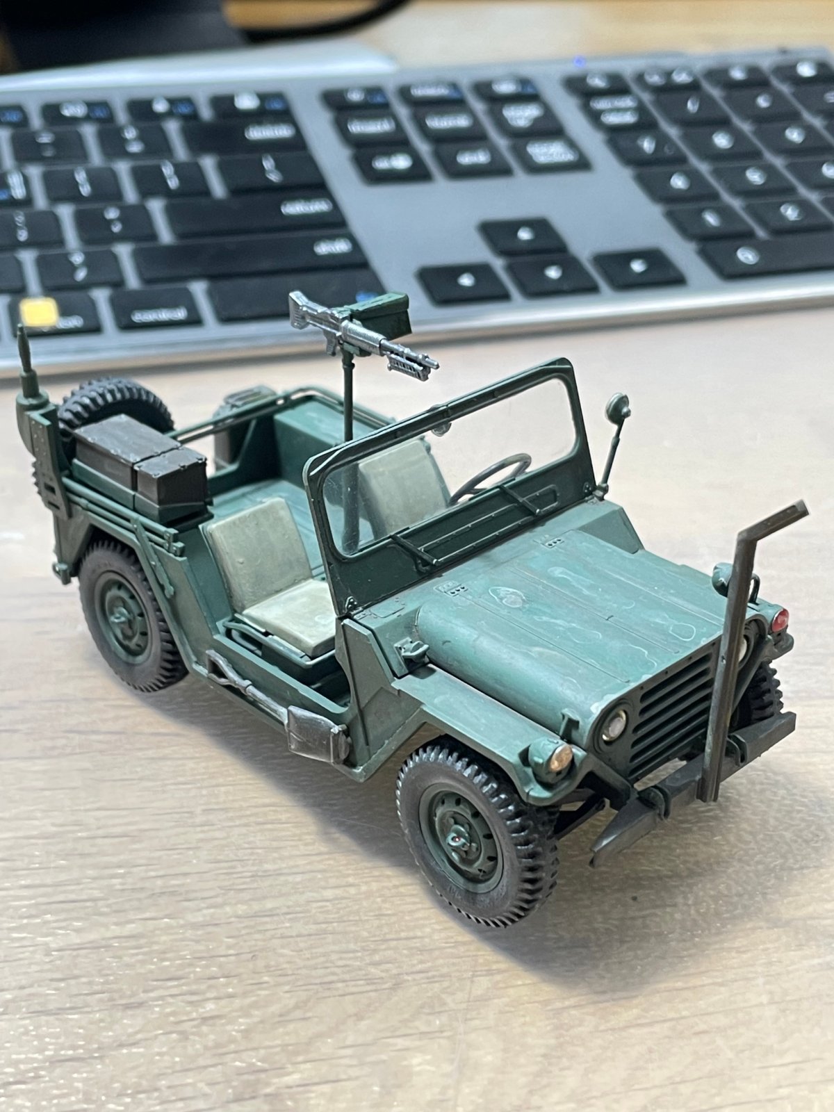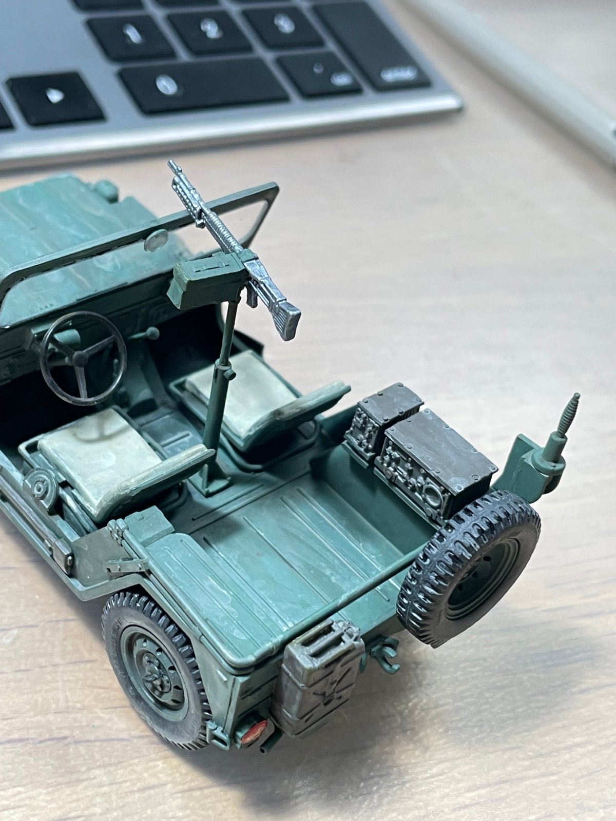 [질문] --> 얼마 전에 만든 모형이야. 도색을 여기까지 진행한 적이 별로 없어서 스스로는 좋아 보이는데, 사실 드라이브러시로 하이라이트 표현하는 거나 웨더링은 제대로 안 들어갔어. 게다가 마지막에 옅은 색으로 묽게 먼지 표현을 하다가 보닛에 인위적인 얼룩이 생겼어. 바예호 등 아크릴 붓칠 작업이고, 개선할 부분을 알려줘.