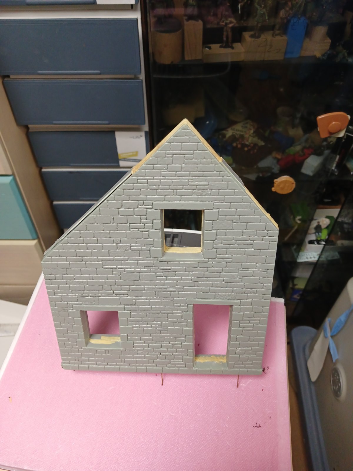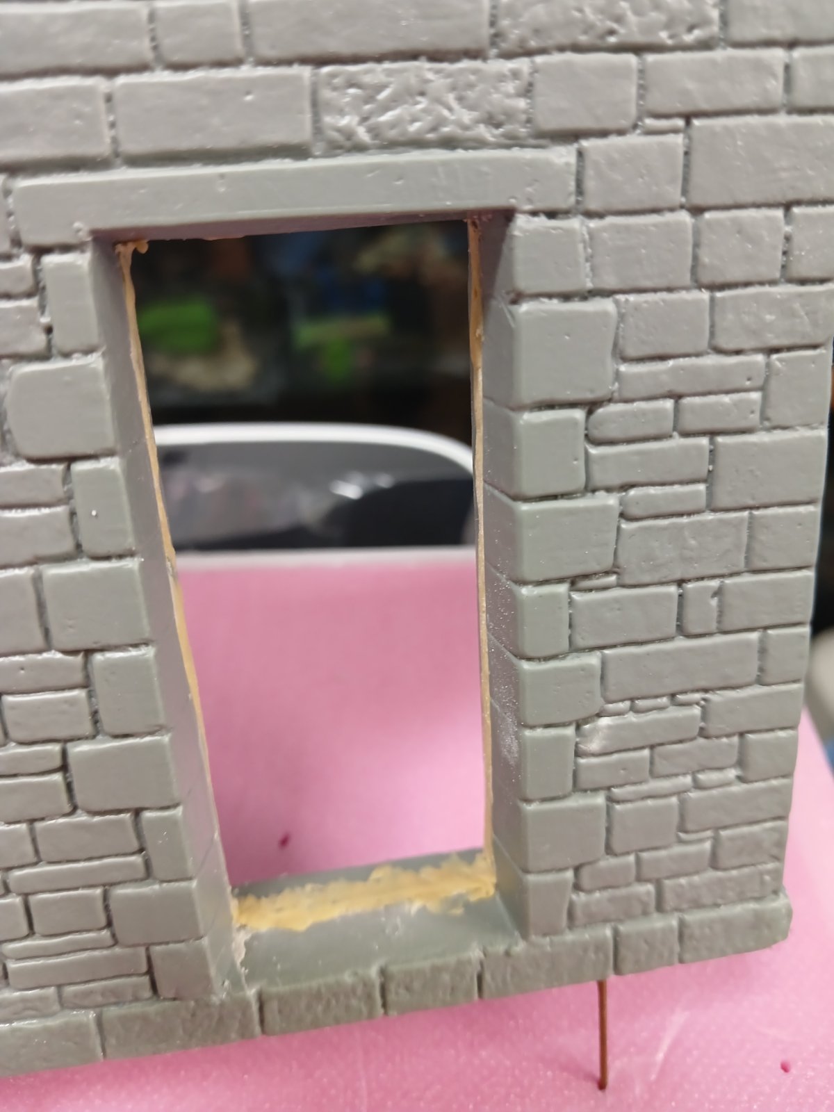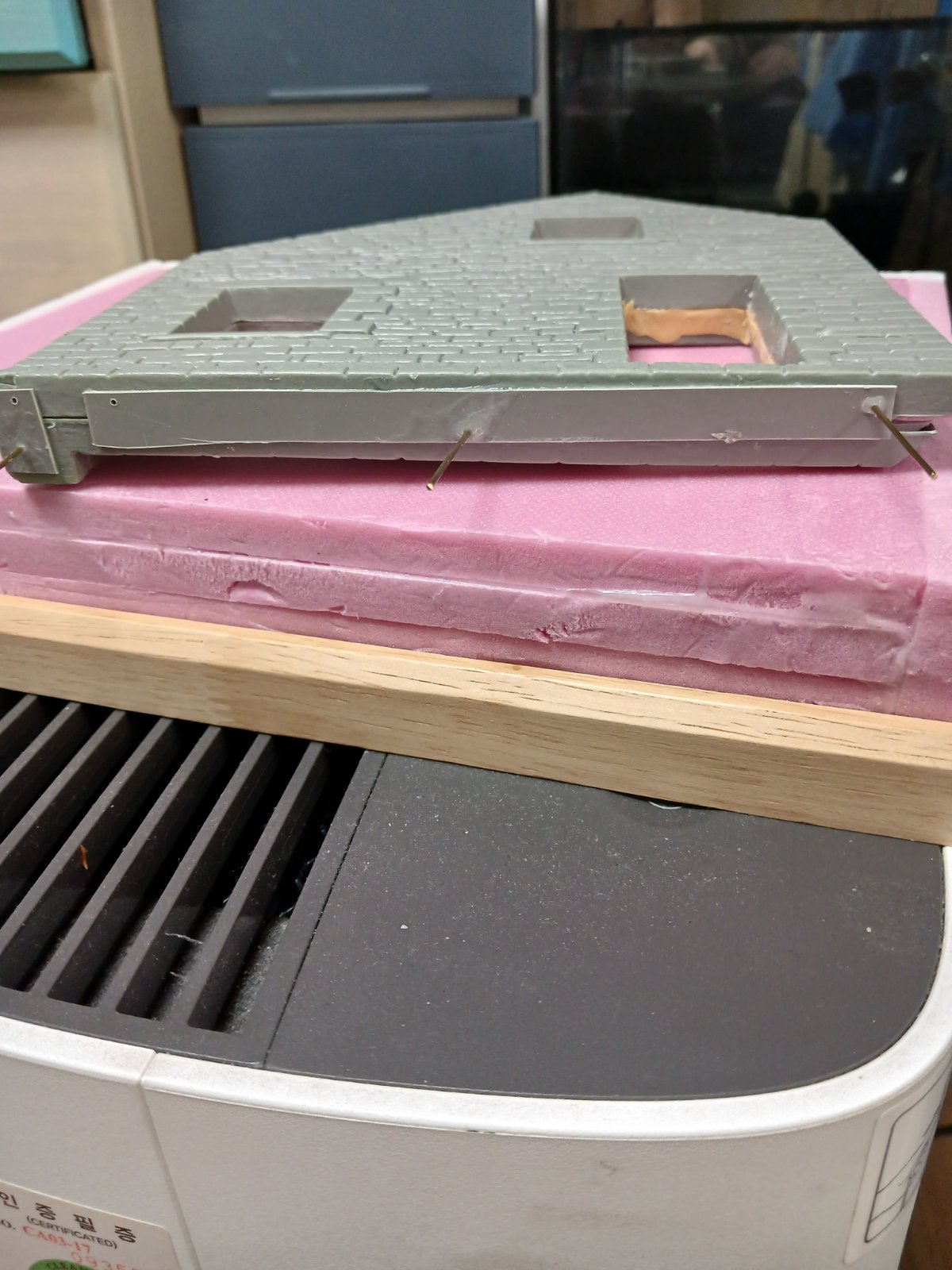 미니아트 건물은 앞뒤판 사이가 벌어집니다 특히 창틀 문틀 부위는 골아픈데 저는 가능한한 폼보드재단 창틀부위 정확하게 하려고노력하는데 그래도 틈 벌어지네요 프라판을 덧대고 황동봉 을 지그재그 박아서 벌어지지않게 하고 그래도 보이는 틈은 얇게편 에폭시퍼티로 가립니다