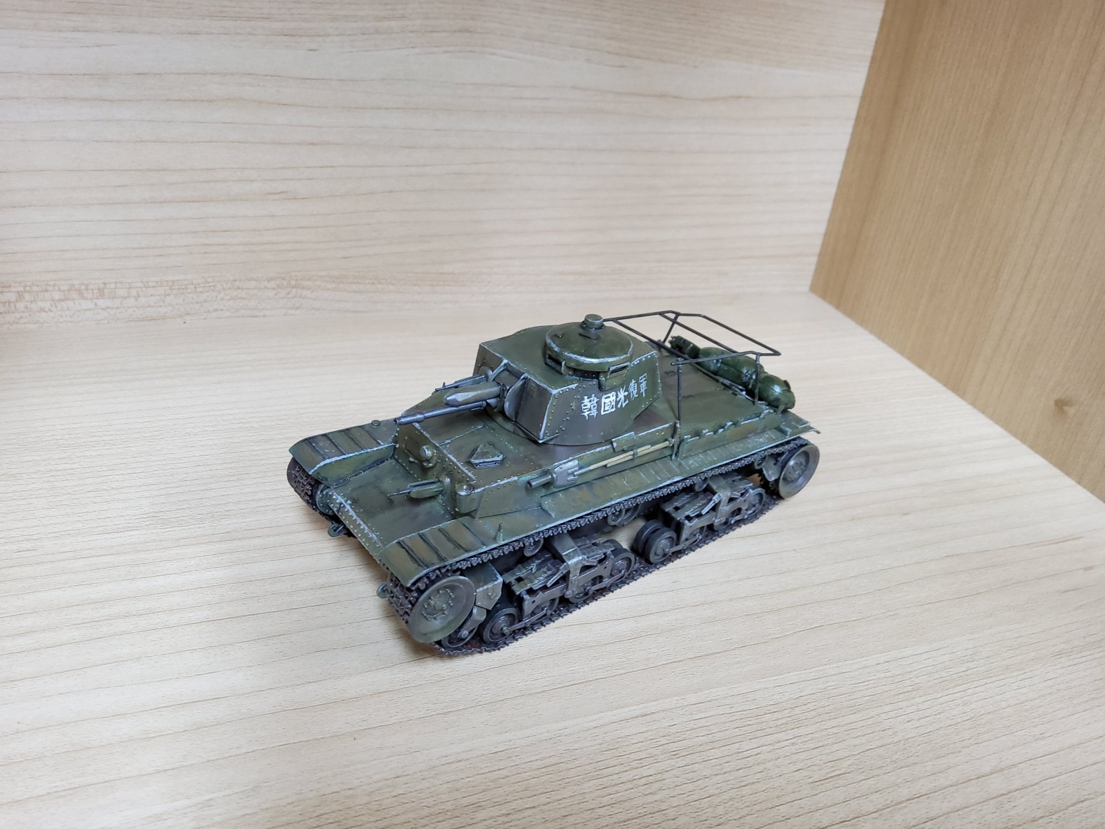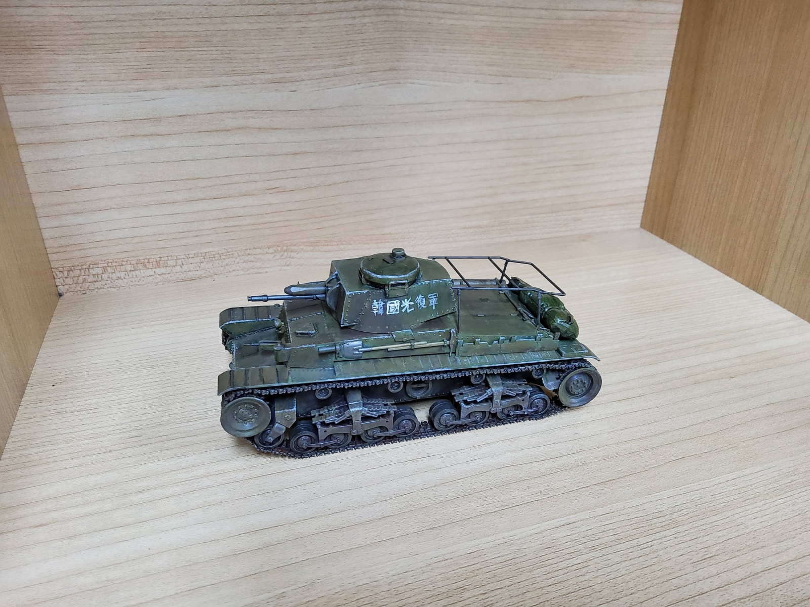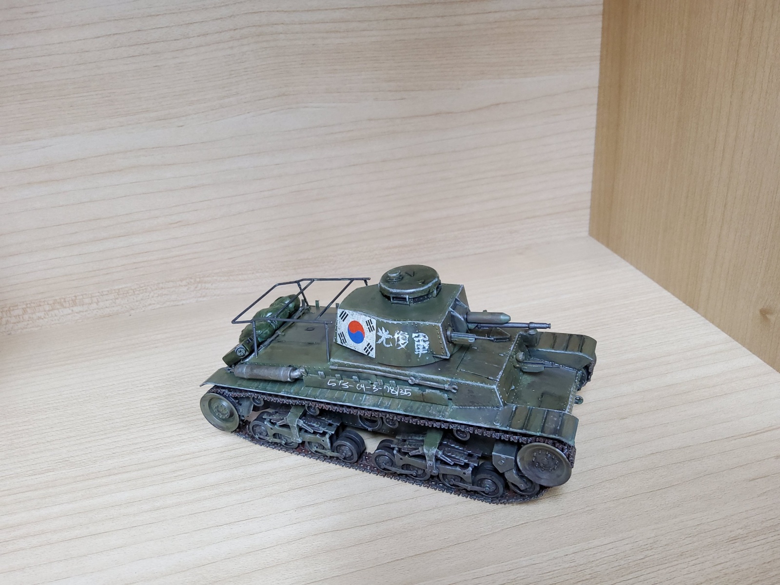 아카데미 1/35 35(t) 입니다. '2차대전 말기, 연합국의 일원인 대한민국의 정규 군대인 광복군이 한반도 북부 침공 작전에 참가'라는 설정으로 만들었습니다. 소련이 35(t)를 노획했더라도 그때쯤에는 너무 낙후된 장비라서 소련군은 사용을 안 했겠죠. 저런 2선급 장비는 아마 넘긴다면 광복군 정도 선에게 넘기기 딱 좋지 않았을까요?
