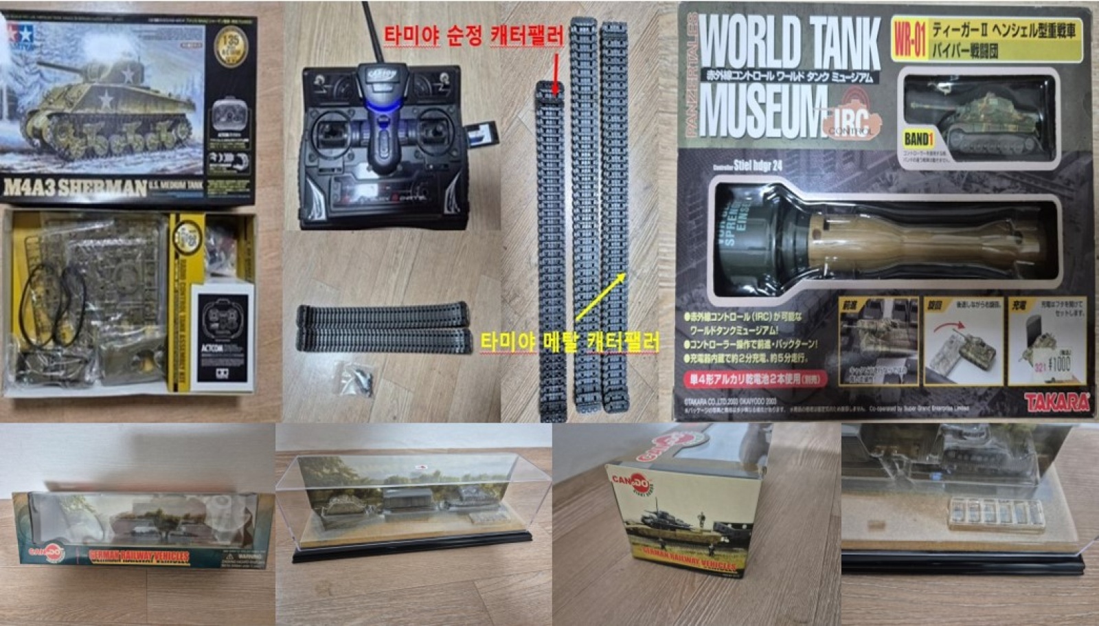 2. 타미야 1/35 4ch 2.4GHZ M4A3 셔먼전차 : 시중가 및 구입가 32만원, 판매가 25만원(택배비 5천원 선불 혹은 착불) 이 키트는 기존 4CH 셔먼에 2.4GHZ 조종기에 플라스틱 연결식 캐터팰러가 동봉된 버전이었습니다. 연결식 캐터팰러는 한번 조립해보니 내구도가 약해 기존 고무 트랙 넣어드립니다. 진짜 RC 구동용 캐터팰러는 메탈 프리울 별매 사시는 편이 낫고, 그게 아니라면 제 상품의 동봉된 타미야 순정 고무트랙 쓰셔도 경사길 안 미끄러지고 잘 올라가고 재밌습니다. 암튼 연결캐터팰러 빠진 가격+할인가에 내놓습니다. 그외 파손 및 분실파츠는 없습니다. 사실분은 연락주세요.