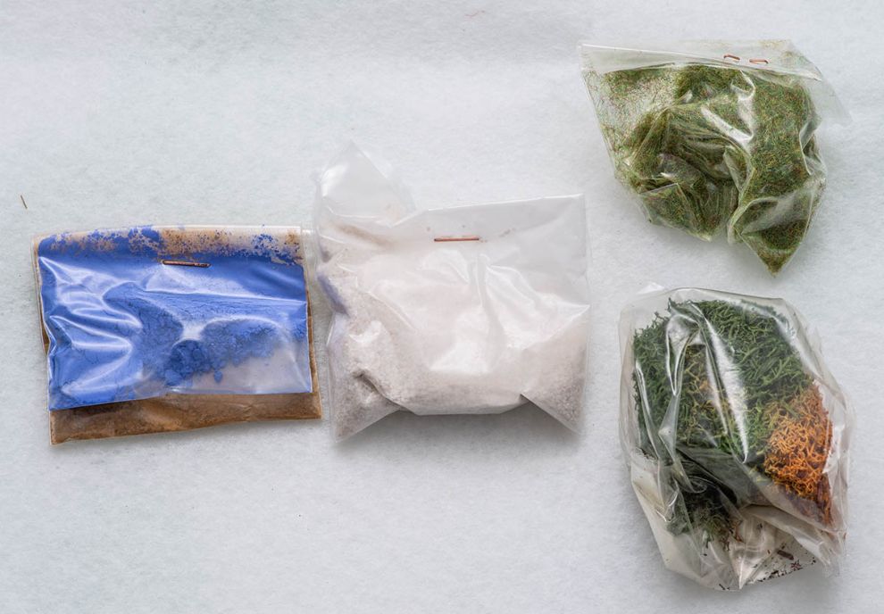 지형 디오라마를 만들 때 사용하라는 바닥 풀 견본과 시냇물 등을 그릴 때 쓰는 물감 안료입니다. 저는 디오라마는 쥐약이라...