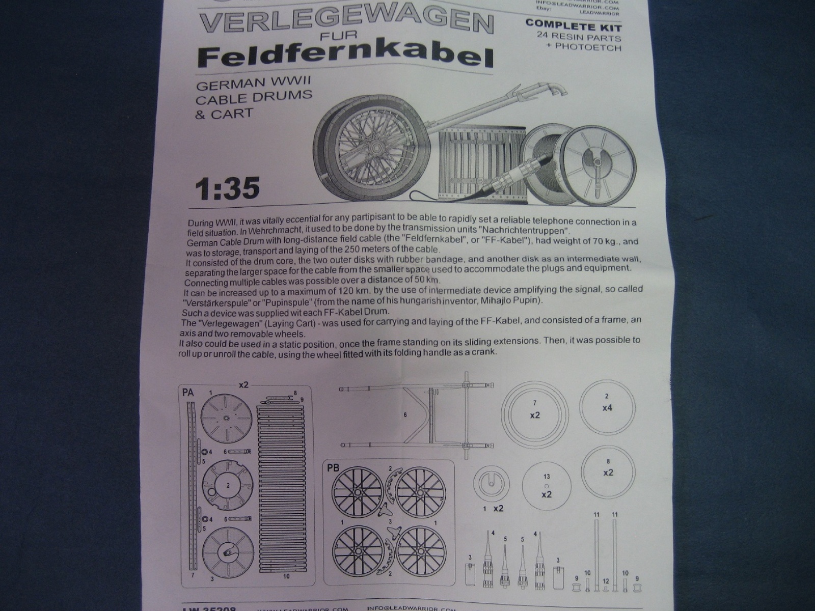 마지막 리드워리어사 통신케이블 카트 입니다 원래는 카트용이지만 내용물을 보면 케이블의 제원이 필드용 이기 때문에 혹시나 맞지 않을까 해서 구입을 했는데 다행이 사이즈가 맞더군요 구성품은 사진에서 보듯이 레진과 에칭으로 구성되어 있으며