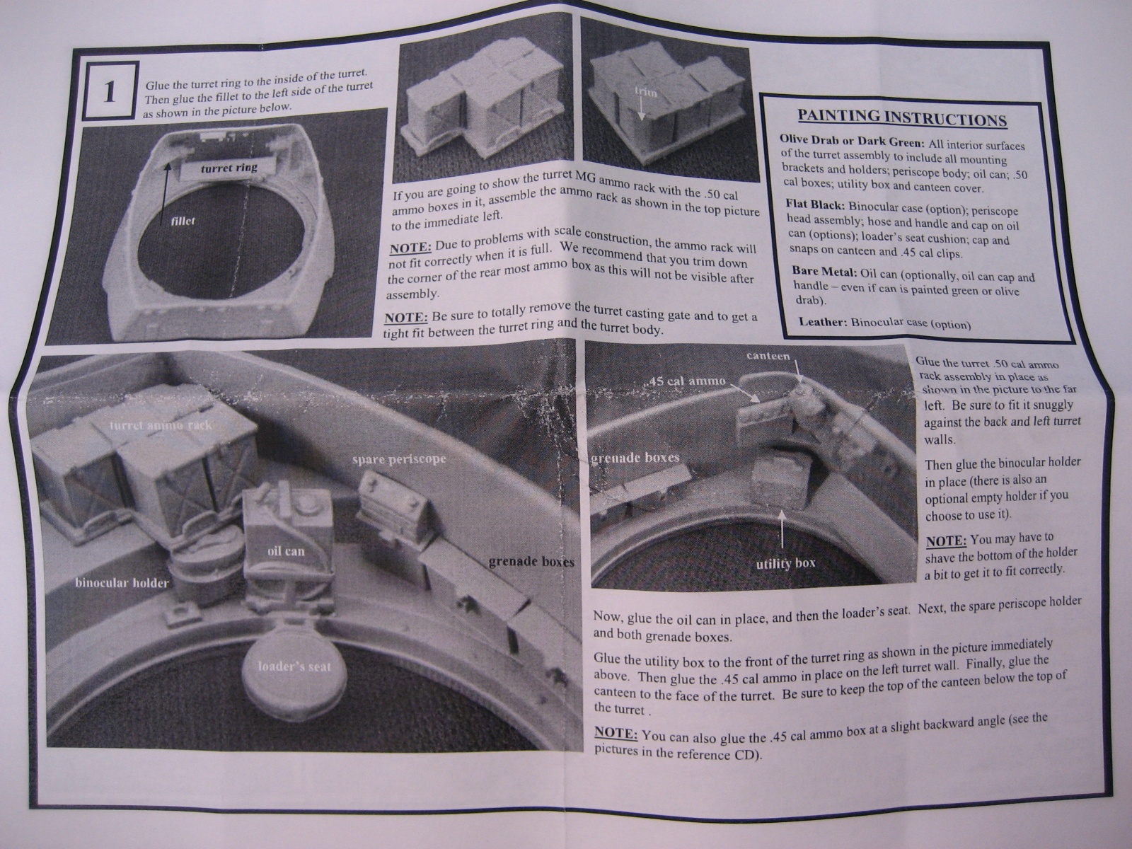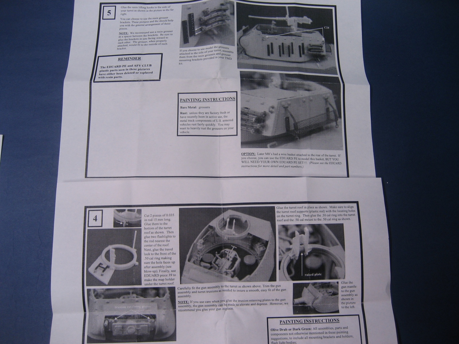 설명서가 앞뒤로 5장 정도 포함되어 있습니다 제품은 옛 사출방식 으로 뽑아내는 제품이고 3D 제품은 아닙니다 예전에 M8포탑만 구입해서 타미야 M8에 올려주었던 적이 있었는데 포탑의 퀄리티가 상당히 좋아서 추가 구매할때 특이한 버전이 있어 구입한 제품입니다 스태그 하운드에 M8포탑이 올라가 있는 제품은 못본것 같아 구매욕을 때기더군요 구성은 포탑과 내외부 를 구성하고 있는 여러가지 부품과 스태그 하운드 상부 포탑결합 부분을 트랜지션 해주는 부품 등등 으로 구성 되었습니다