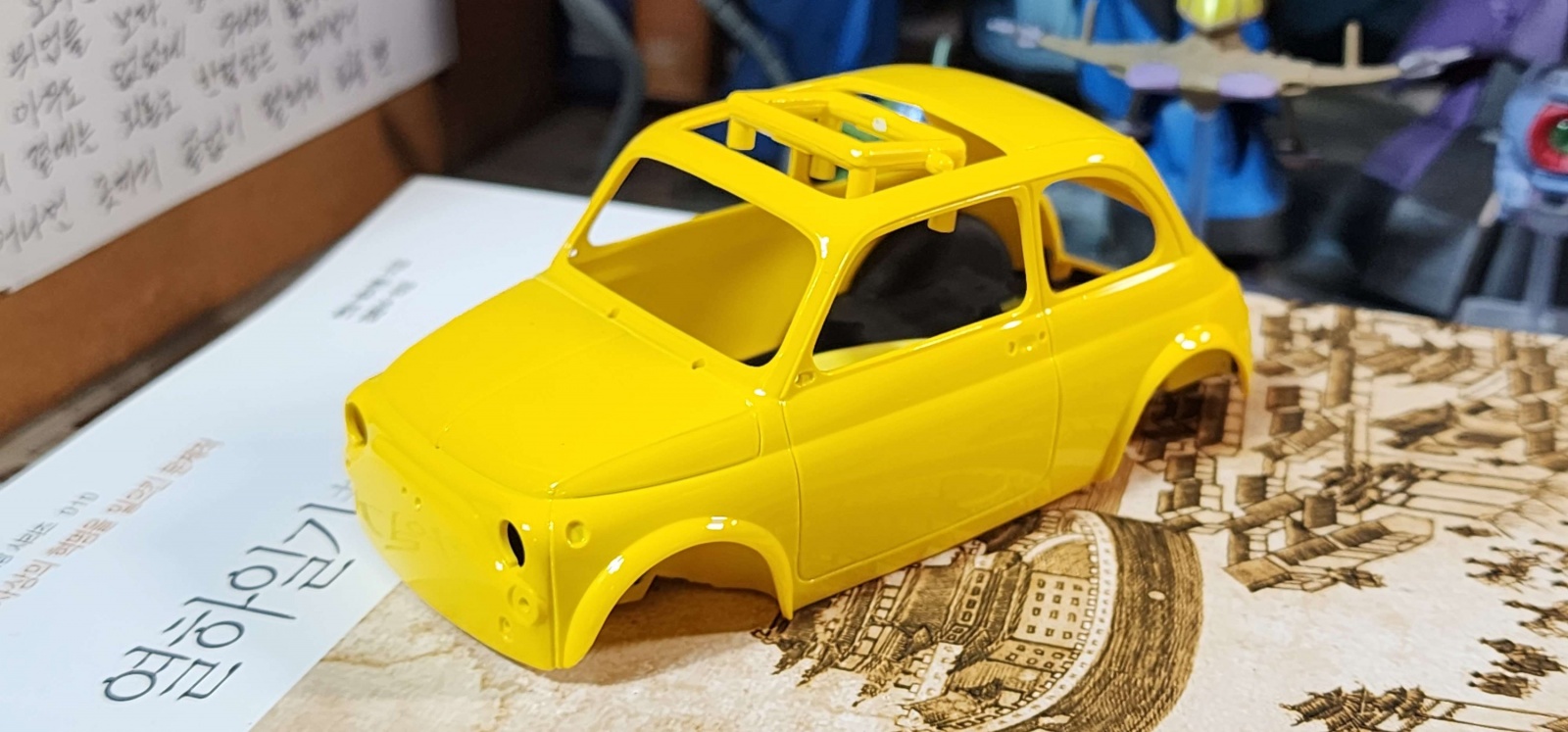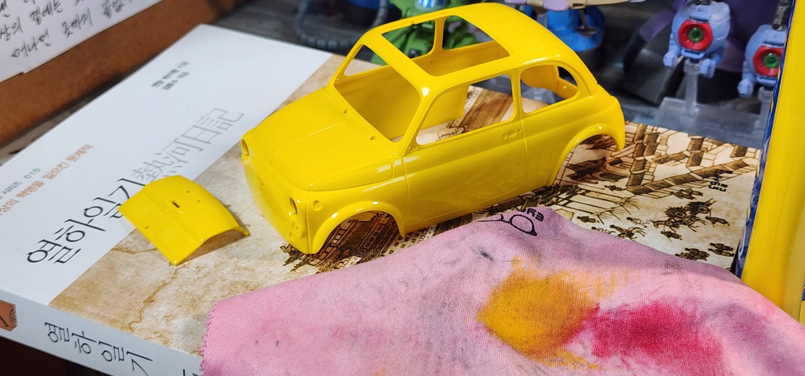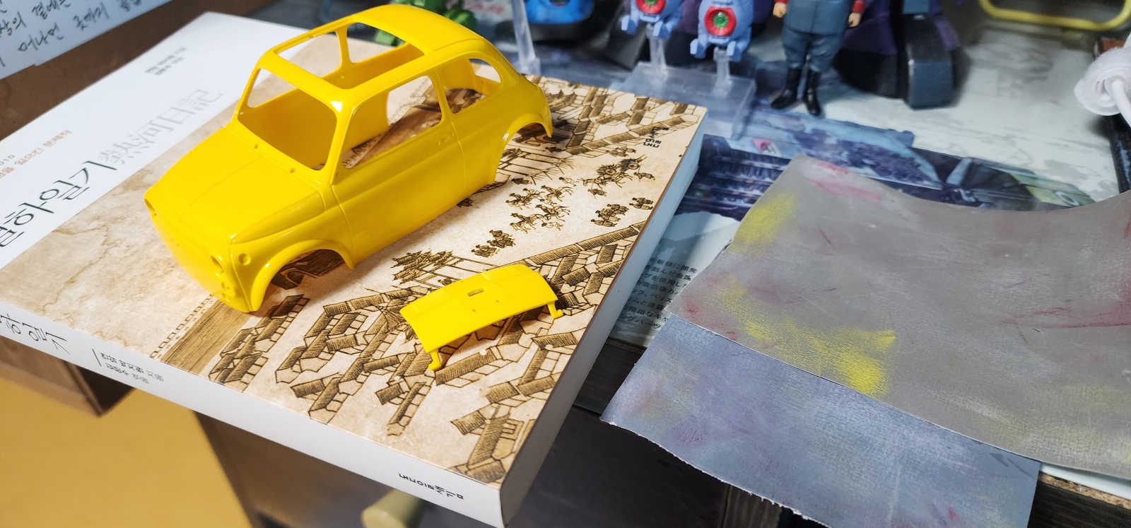 이번에 국립중앙박물관 이순신 특별전을 관람하고 도록도 사오고... 용산 아이파크몰에 들려서 선물받은 피아트에 필요한 타미야 TS-16 스프레이도 사게 되어 이틀간 제작에 돌입했습니다. 제가 미니 쿠퍼와 함께 좋아하는 소형차인데 생각보다 타미야에서 재현한 500F의 경우는 노란색 버전 사진을 구하는게 은근 어렵더군요. 주로 하늘색이 많이 나옵니다. 다만 저는 어릴때부터 영화 <카> 시리즈 덕분에 노란색의 피아트 500이 익숙하기도 하다보니... 노란색으로 칠하기로 했네요. 아마 다 만들면 저 사진처럼 될 거 같습니다.