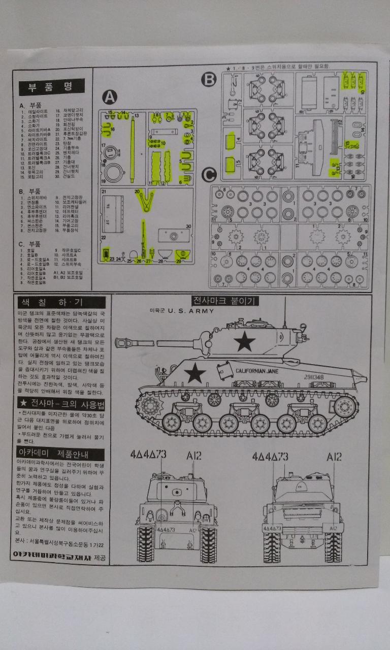 흠품에 형광펜을 칠해보았습니다. 주로 A러너에 있는 부품이 파손되어 떨어져나간 상태입니다. 구판 아카데미 제품을 구득하기가 어렵지 않다면 A러너만 구하면 거의 해결이 될 수 있지만, 그렇지 않기에, 아카 신판이나 타미야 제품의 부품을 구해서 크게 다르지 않다면 수리를 해볼 생각입니다.