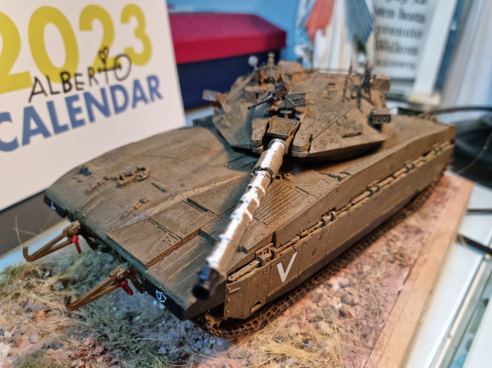 아주 오래오래 묵혀뒀던 아카데미 1/35 메르카바 Mk.2D를 이-하마스 전쟁 발발을 계기로 만들었습니다. 그런데 시나이그레이의 위장효과가 탁월해선지 락카 페인트를 흰색을 섞어 채도를 낮추지 않고 그대로 적용했더니 몰드의 입체감마져 묻히는 효과가 발생했습니다.