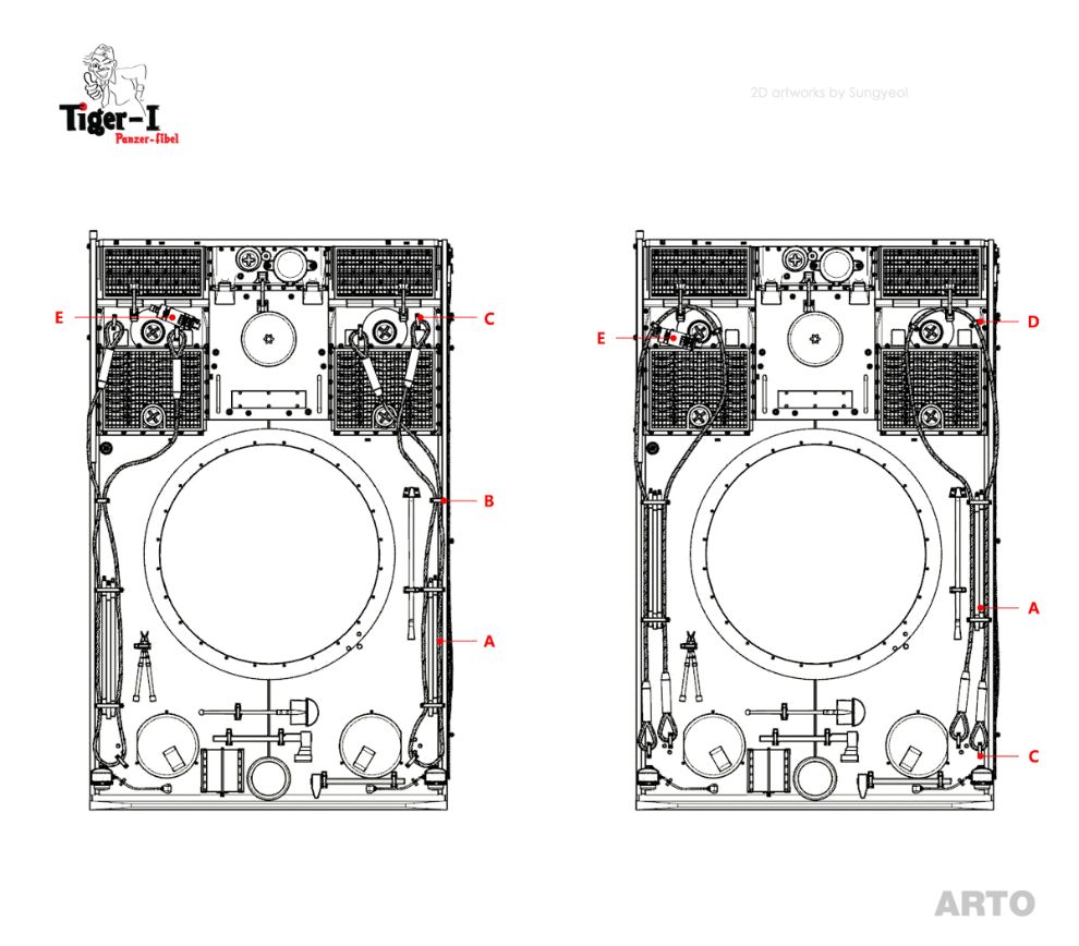 C) 차체 상면, 후방의 라디에이터 상면 장갑 양옆으로 자리하던 견인 로프 고리 고정구는 방향 변화에 따라 상면 앞쪽, 운전수와 무전수 햇치 측면으로 위치를 이동하게 됩니다.
