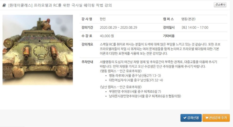 8/29에는 스케일 RC와 극사실 웨더링 강의를 기획했으니 필요하신 분들 등록 부탁드립니다.