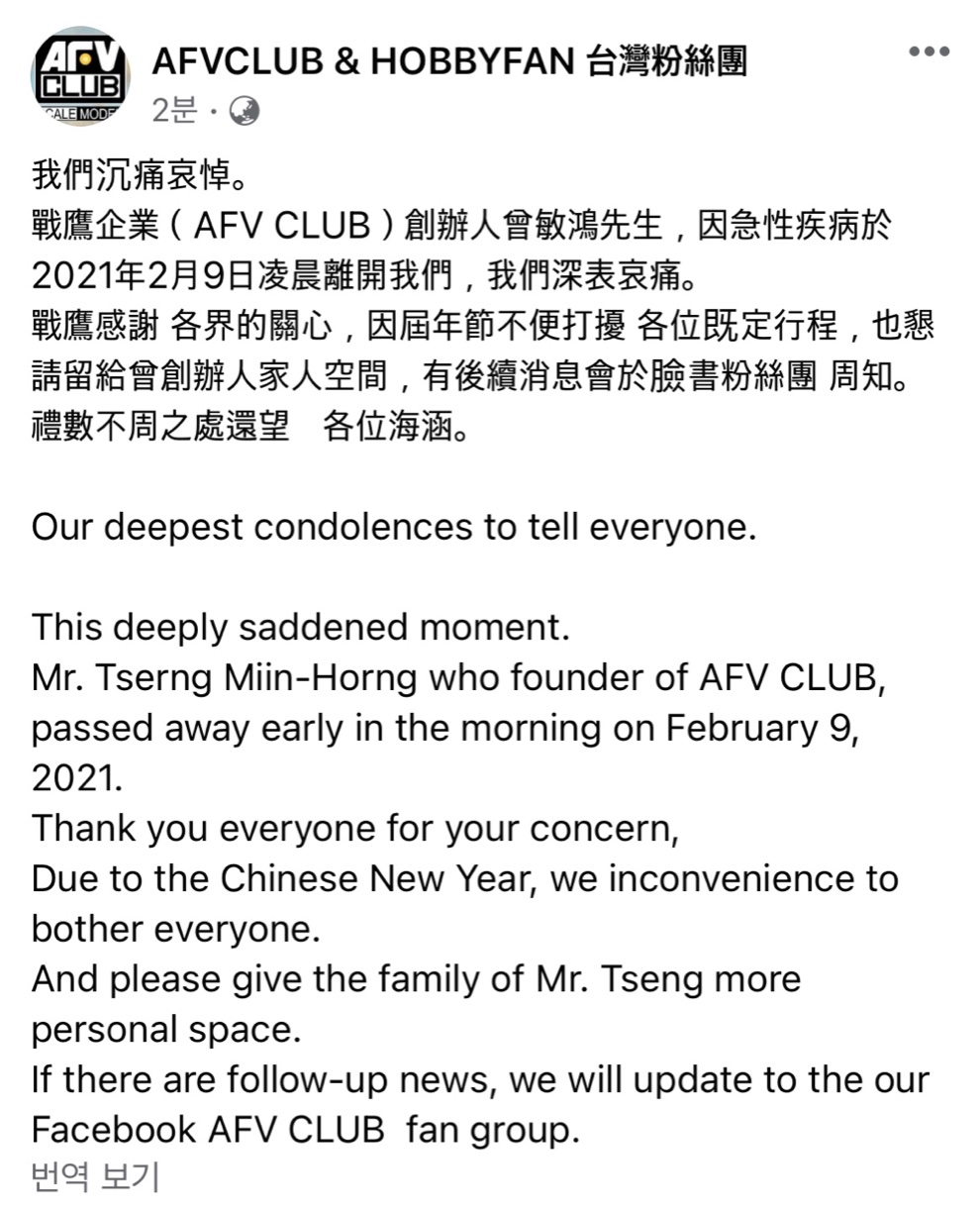 우리에게 너무 익숙한 메이커인 AFV Club 사장님이 2월 9일 오전 급성 질환으로 운명하셨습니다.