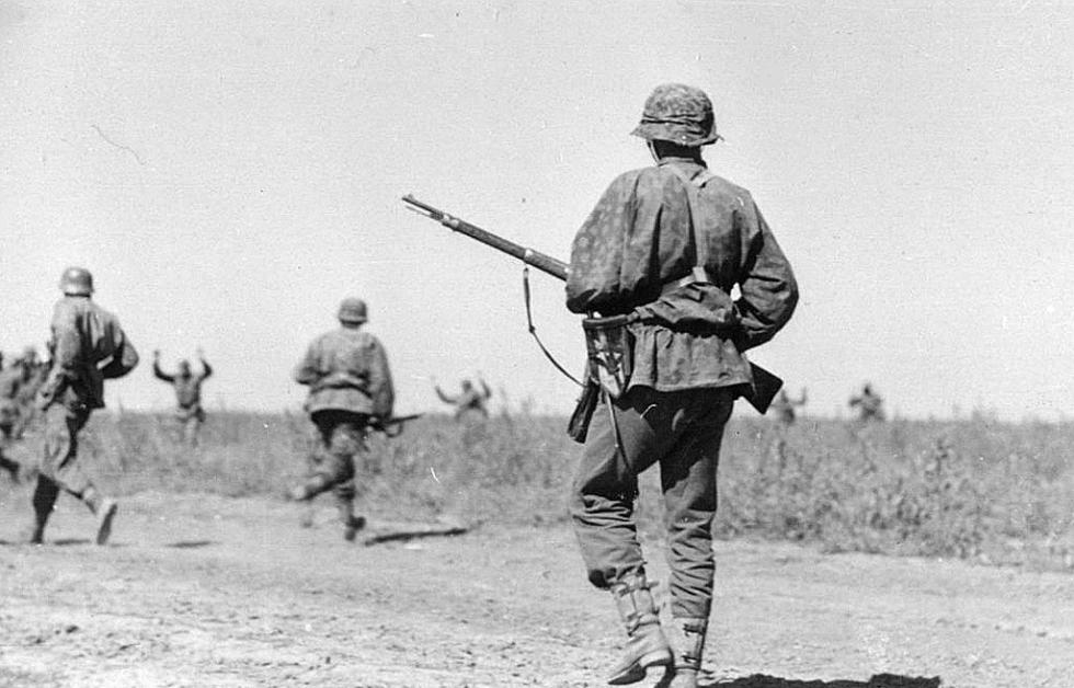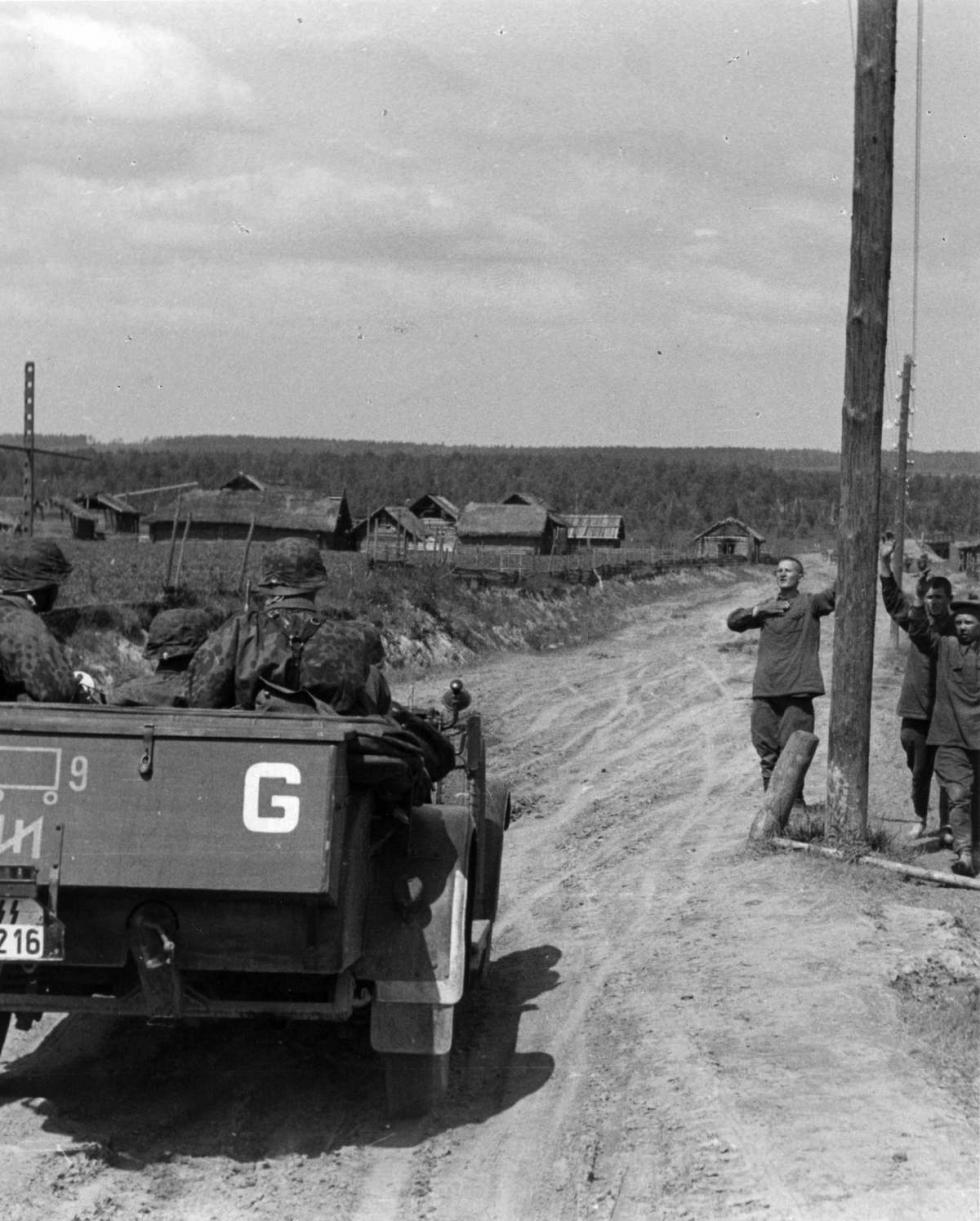 1941년 우크라이나의 1SS 사단 병사들과 항복하는 소련군 포로들.
