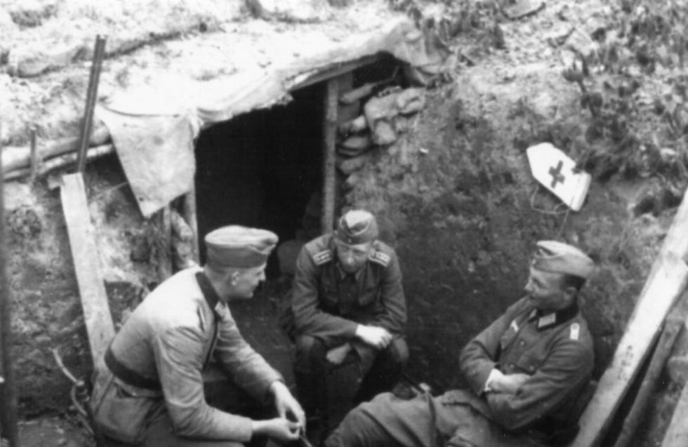레닌그라드 전선의 참호안에 장교들..