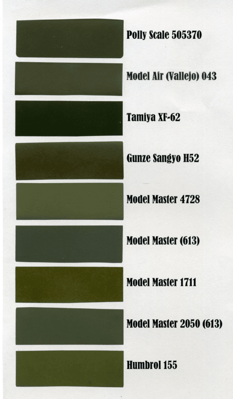 도료 및 색상에 대한 이 환장하도록 복잡한 설명들은 하나의 당연히 한 가지 의문으로 이어진다. 그래서 내 2차대전 미군 전차 모형을 대체 무슨 색으로 칠하란 말인가? 역사 수업은 할 만큼 했으니 이제 모형용 도료를 확인해 보자. 필자는 일반적으로 쓰이는 여러 종류의 모형용 올리브 드랍 도료가 자연광, 형광등, 백열등 아래에서 필자의 TT-C-595 규격 3412번 및 변경 전 FS 34087 컬러칩의 색상에 얼마나 부합하는지 비교해 보았다. 그 결과는 아래에 요약되어 있다. 대전기 올리브 드랍과 근접한 색상은 기본적으로 타미야 아크릴 XF-62 뿐이고, 그 다음은 폴리 스케일 아크릴이겠지만 타미야와는 격차가 있다. 군제와 모델 마스터는 FS-595A 초판의 함정에 걸려 대전기 올리브 드랍에 비해 너무 밝고 선명하다. AN 613 다크 올리브 드랍에 해당하는 모델 마스터의 도료 두 종은 지나치게 잿빛이다. 험브롤 155는 녹색 빛이 과도하다.