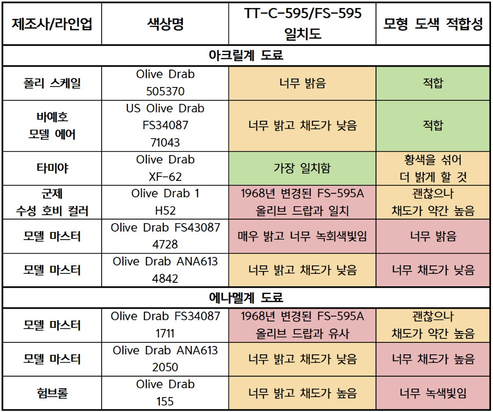 필자의 추천은 고증에 부합하는 색에서 출발해 적절한 결과를 얻을 때까지 조금씩 조정하는 것이다. 아주 어두운 색으로 워싱을 할 생각이라면 밝은 톤에서 시작하라. 필자는 타미야 올리브 드랍을 좋아하지만 대전기 기갑차량의 모형에 적용할 때는 항상 다크 옐로우(팬저 옐로우)를 섞어 톤을 밝게 하는데, 근본적으로 올리브 드랍은 황토색과 검정색의 혼합물이기 때문이다. 올리브 드랍의 톤을 밝게 하기 위해 흰색을 섞는 것은 도료의 채도를 떨어뜨려 잿빛으로 만드므로 피할 것을 강력히 권한다. 아이러니하게도, FS-595 규격에서 미세하게 어긋난 색상을 사용해 스케일 이펙트를 재현할 수 있다. 폴리 스케일 도료는 앞서 실험한 아크릴판의 색상과 거의 일치하고, 모델 에어 역시 비슷하다. 군제 아크릴과 모델 마스터 에나멜은 FS-595A에서 변경된 색상을 따라간 것으로 보인다. 그로 인해 스케일 이펙트가 적용된 올리브 드랍과 가까워졌는데, 높아진 채도로 인해 색이 지나치게 선명하긴 하지만 이는 약간의 웨더링으로 상쇄할 수 있다. 아래의 표에 각 도료가 모형용으로 얼마나 적합한지 적어 두었는데, 다만 이는 필자의 의견일 뿐 어떠한 과학적 검증 결과를 말하는 것은 아니다.