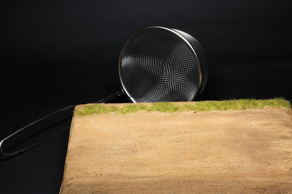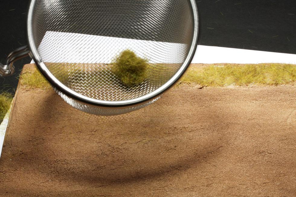 3) 사진과 같이 철망간격이 약2mm 정도의 채나 망을 이용하여 스타틱그라스를 뿌려줍니다.