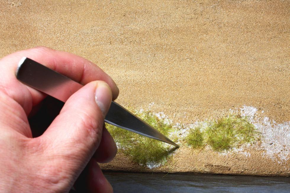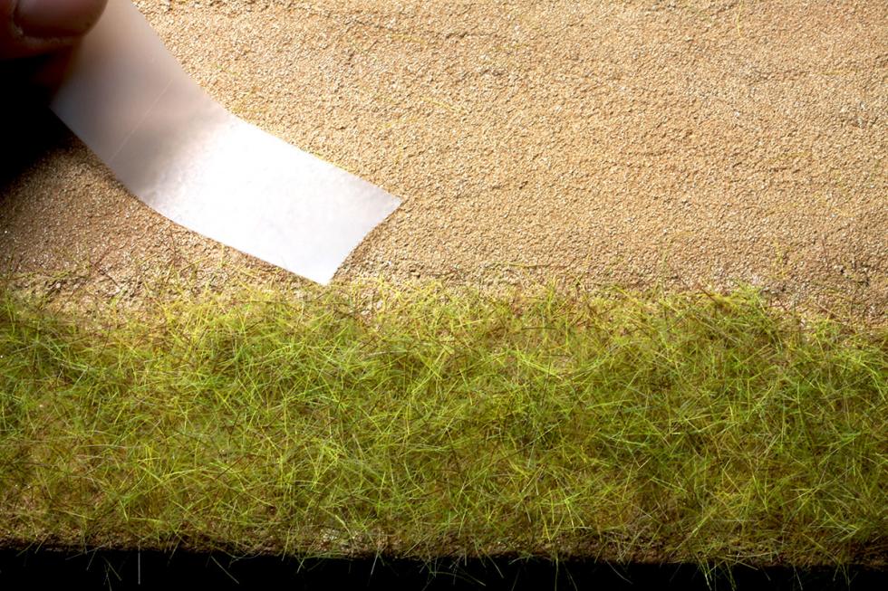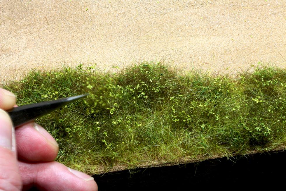 1) 와일드그라스를 손으로 뜯거나 가위로 오려서 완성한 잔디지대위에 올려줍니다. 스프레이접착제가 이미 뿌려져있는상태임으로 살짝 올려주면 접착이 됩니다.