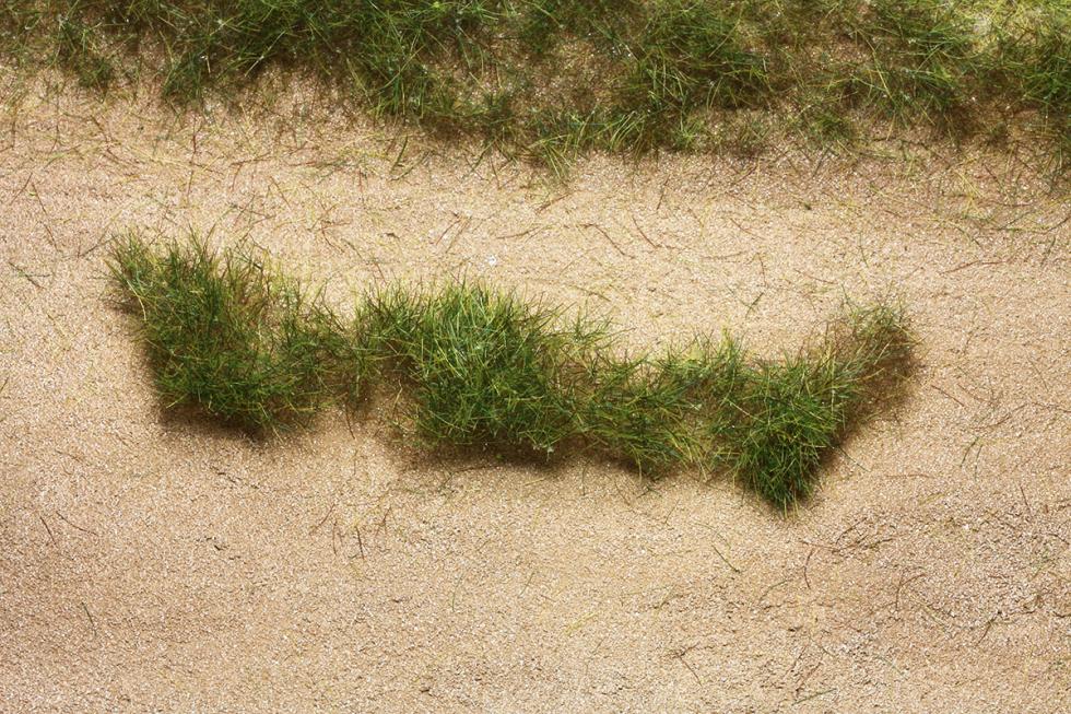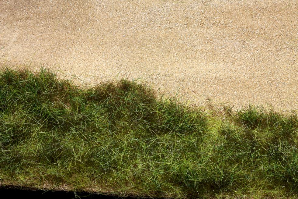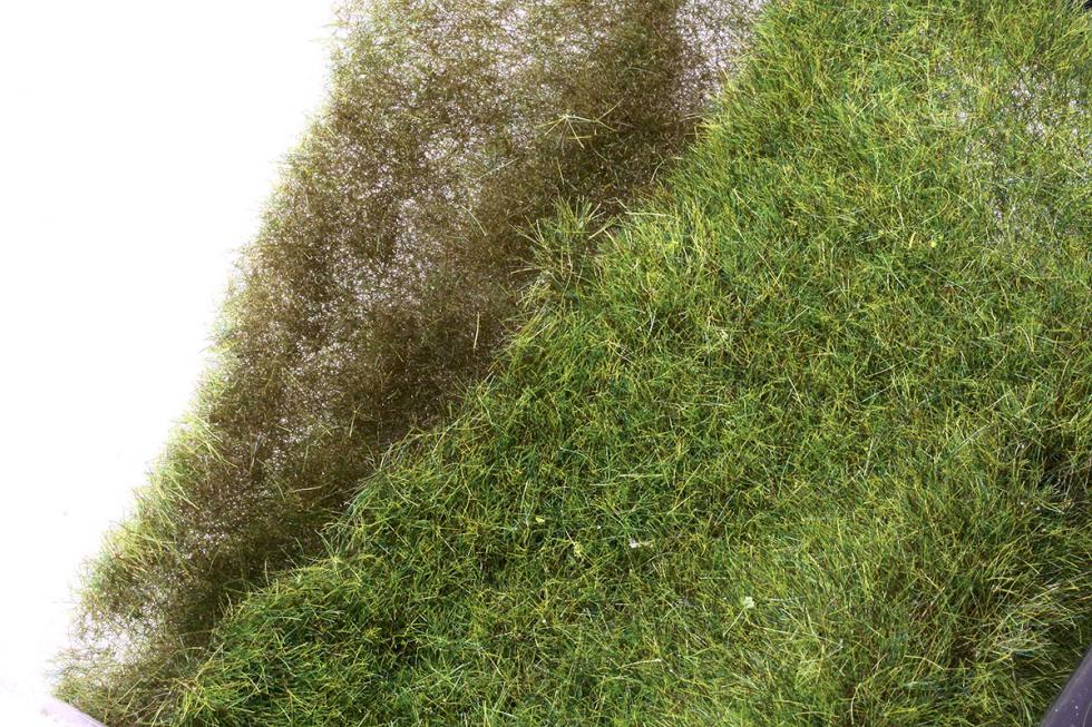 와일드 그라스는 단섬유에 스타틱그라스가 붙어있는 형태의 잔디/풀 표현재료입니다. 사진을 보면 윗부분은 녹색계열의 풀색이지만 잔디가 그라운드에 붙는 밑부분은 어두운 색감을 띠고있습니다. 엄버계열의 이 짖은색상의 단섬유가 와일드그라스의 핵심소재로써 지면의 잔디또는 땅색과 어울려져 자연스러운 연출이 가능하게 합니다.
