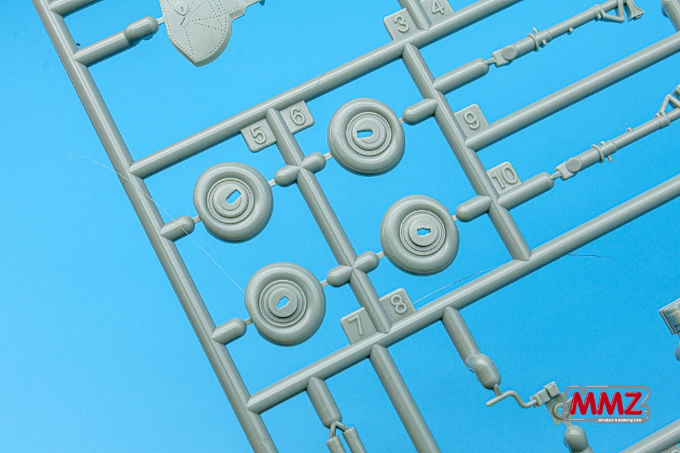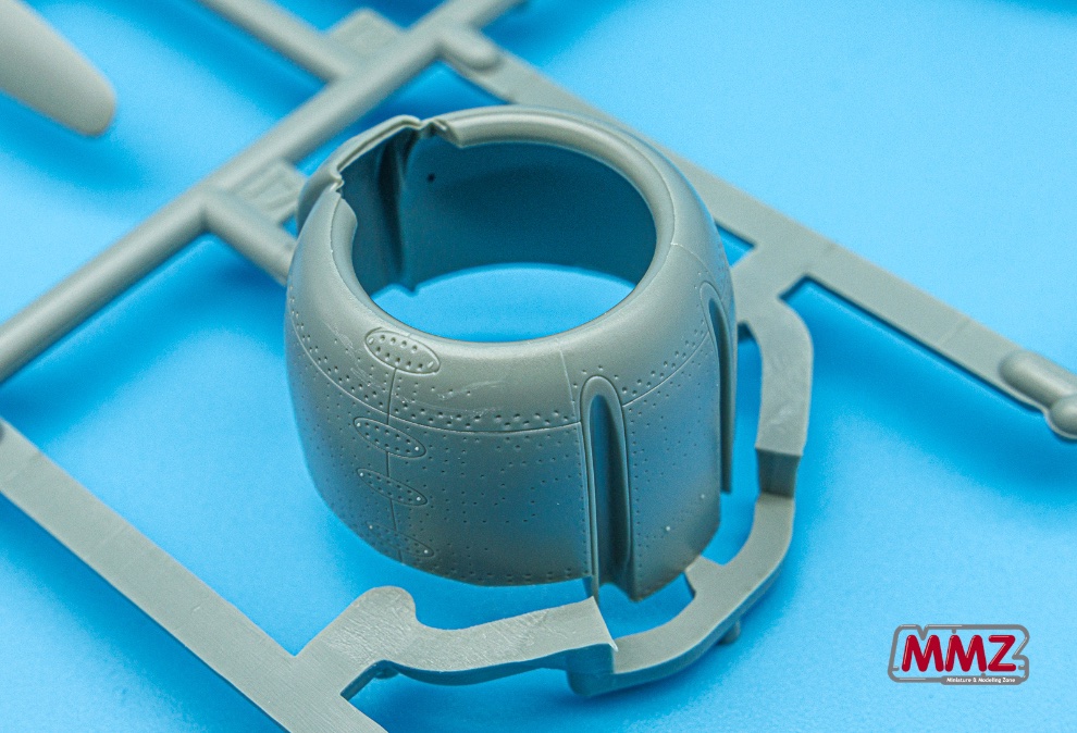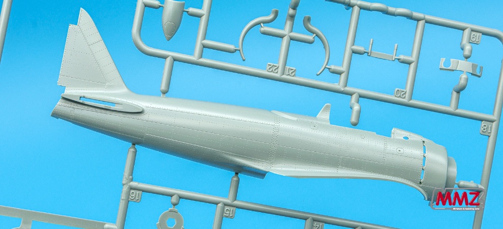 동체부품 사이에 다중 슬라이드 금형으로 일체로 재현된 엔진 카울링 부품이 시선을 잡습니다. 보통 좌우분할과 기관총구가 있는 상면을 따로 분할하는데 아카데미 제품은 한 부품으로 재현하고 있습니다.