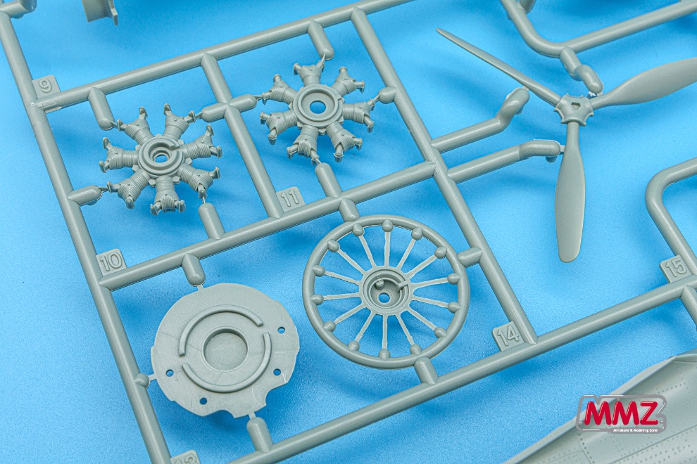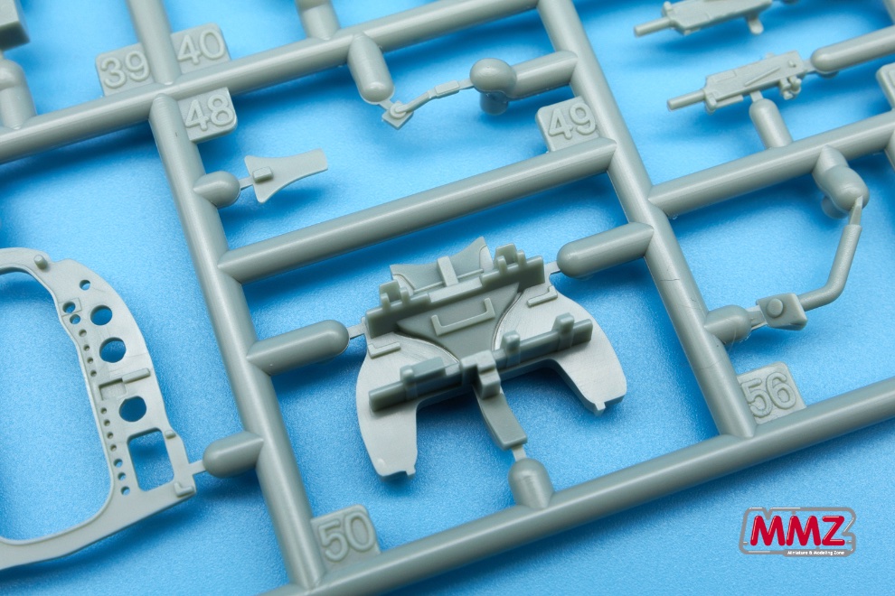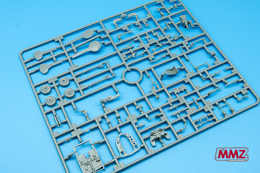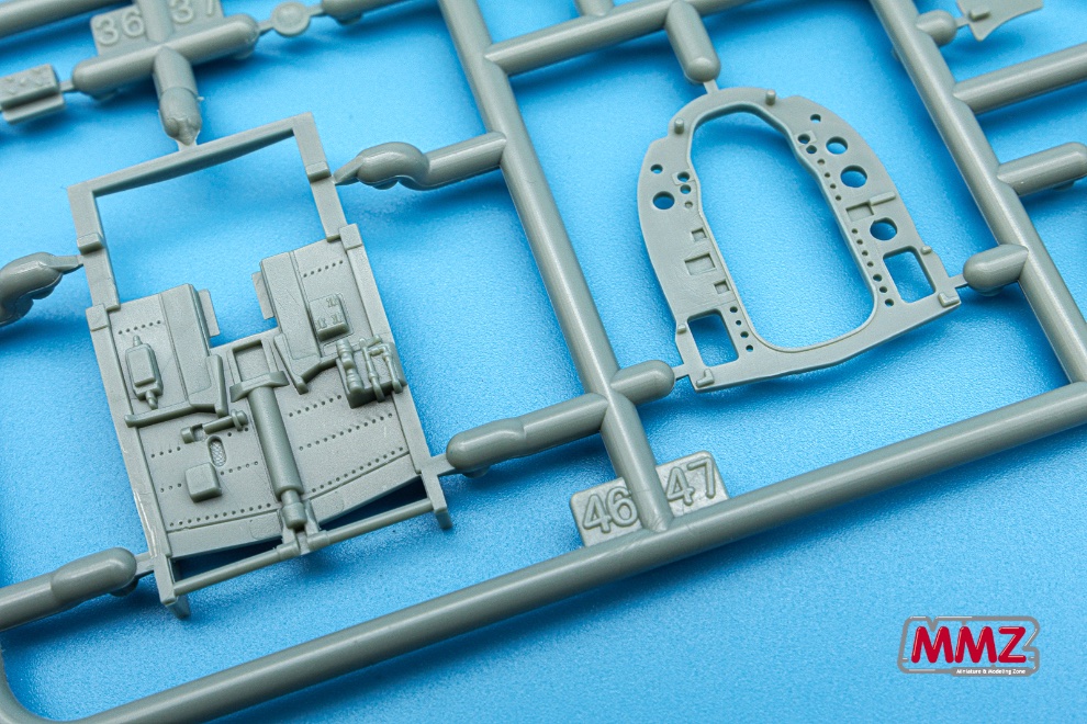 조종석은 최근에 나온 프로펠러기 키트와 비교해도 많은 부품으로 상당히 정교하게 구성되어 있습니다. 전면 계기판 위에 붙은 기관총 몸체와 잘게 나누어 진 좌우의 사이드 콘솔 역시 부품 하나하나로 재현되어 있습니다. 시트 역시 무게를 줄이기 위해 구멍이 뚫린 특징을 재현하고 있습니다.