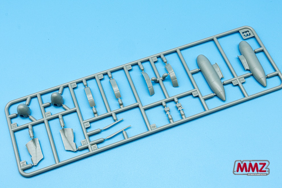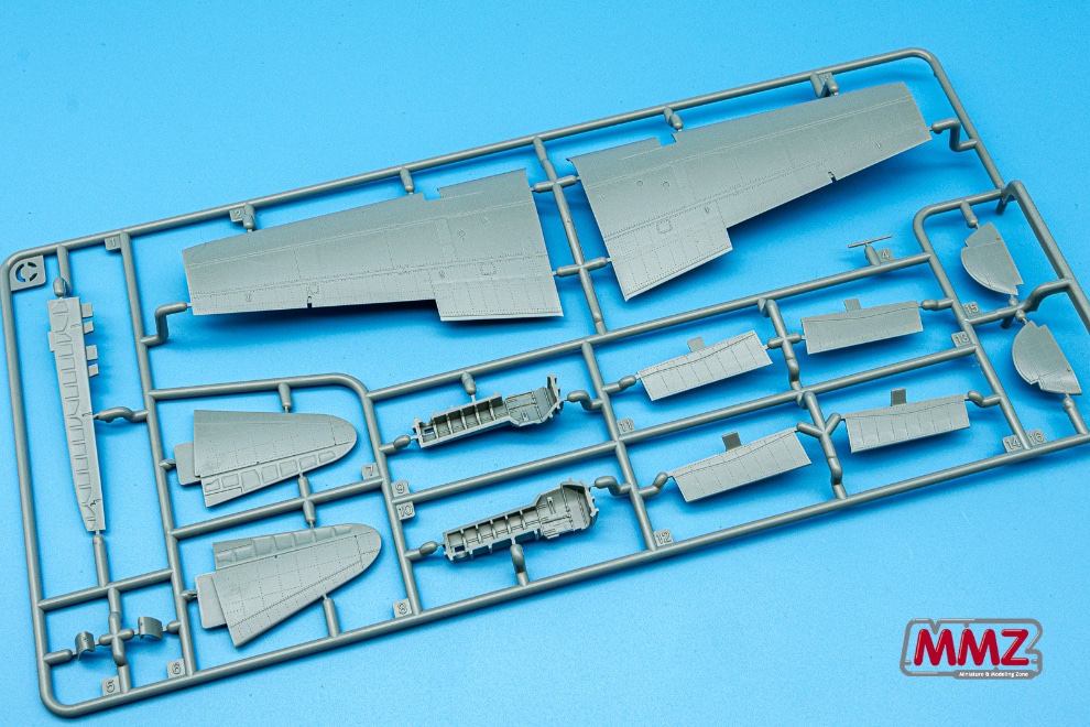 박스를 열면 회색으로 사출된 런너들이 눈에 들어옵니다. 동체와 주날개 상/하면 부품, 조종석 외에 작은 부품 런너, 투명 런너로 구성되어 있습니다.